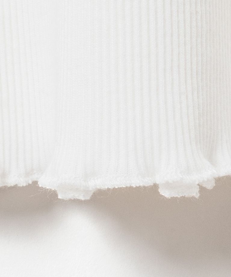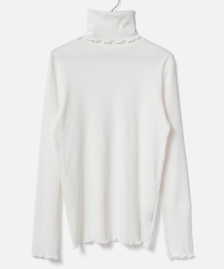 カットリブのロングタートルネック。少し長めの襟(長さ約24㎝)は綺麗にたたまずクシュと自然に、襟先はメローロックで軽さを出しています。緩いシルエットでインナーとしてもお勧め。ニットやシャツのインに着ていただきやすいサイズ感です。