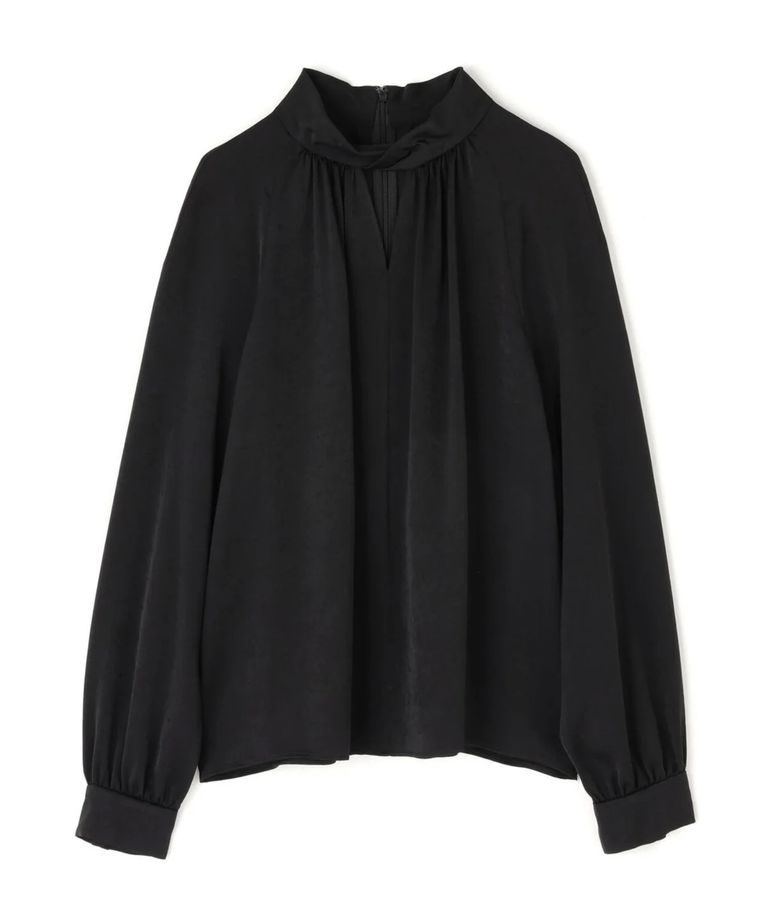 とろんとした落ち感と上品な光沢感のあるサテン地に、小柄ドットを乗せました。ひねりスタンダードカラーの胸元にVカットを施し、品よく肌見せ。首元に沿うスタンドカラーと衿周りに寄せたギャザーによって生み出されるふんわりとしたフォルムで柔らかな女性らしい雰囲気に。ジャケットインにした時にも顔まわりにほど良いボリューム感と華やかさをプラスしてくれます。