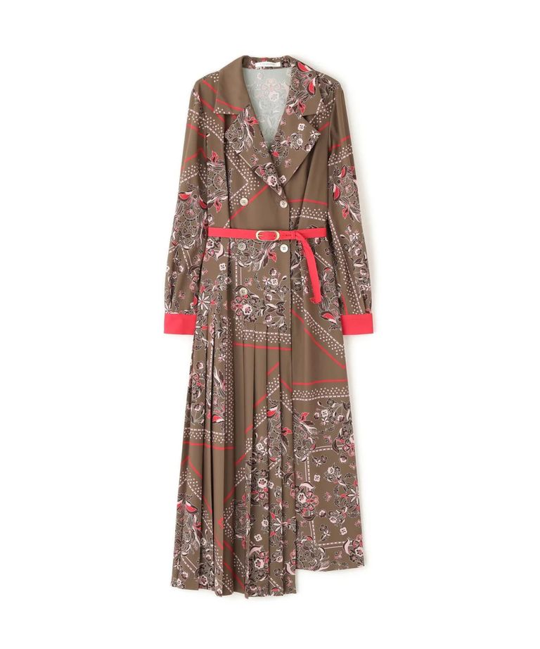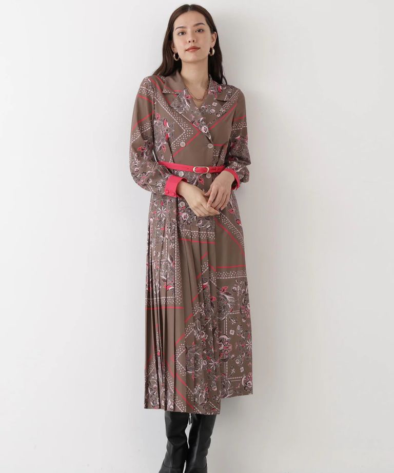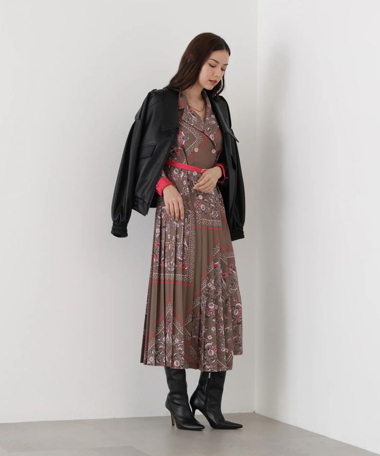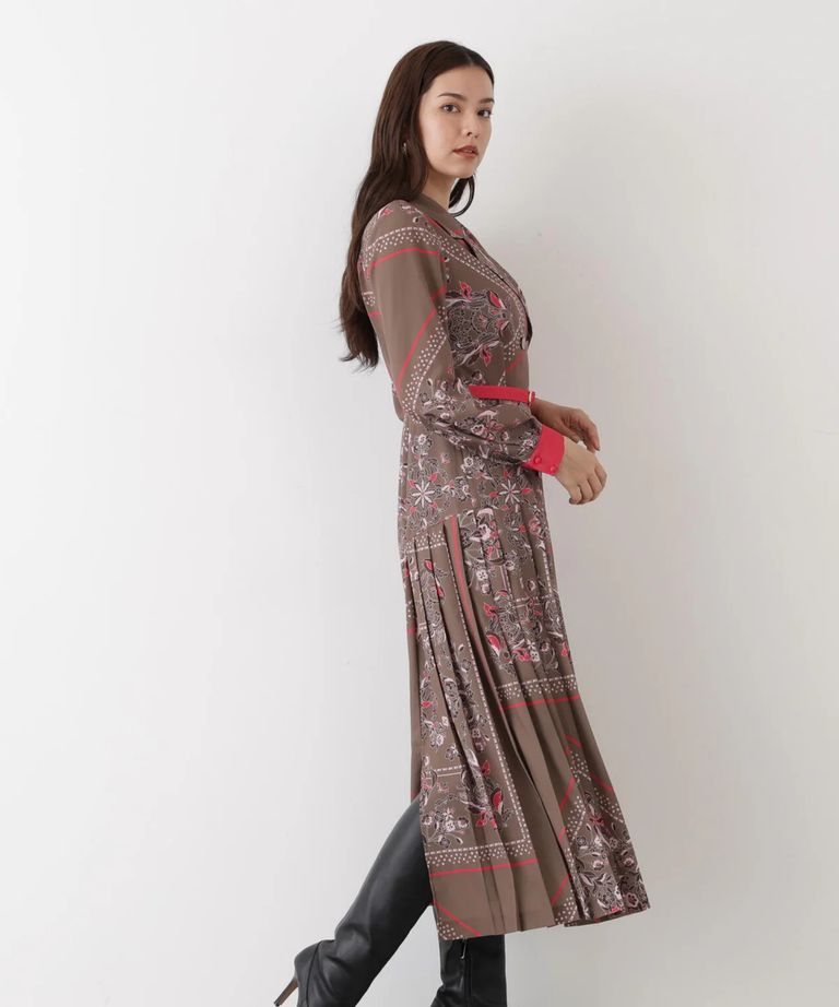 クラシカルなスカーフ柄が印象的な、上品で華やかなプリーツワンピース。上身頃はテーラードカラーとダブルブレストデザインでトラッドな雰囲気に仕上げ、スカート部分はラップ風のプリーツデザインで動きのある美しいフレアシルエットを演出。ヒップ下から広がるプリーツが、女性らしさと上品さを引き立てます。ウエストの細ベルトとカフスにはカラー切り替えを施し、全体に華やかなアクセントを添えた、洗練されたクラシカルスタイルの一着です。