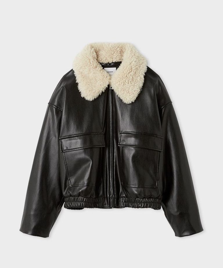 ファー衿ショートブルゾン(ブラック)合成皮革 / 取り外しファー衿付き / コクーンシルエット / MWFJ255013
