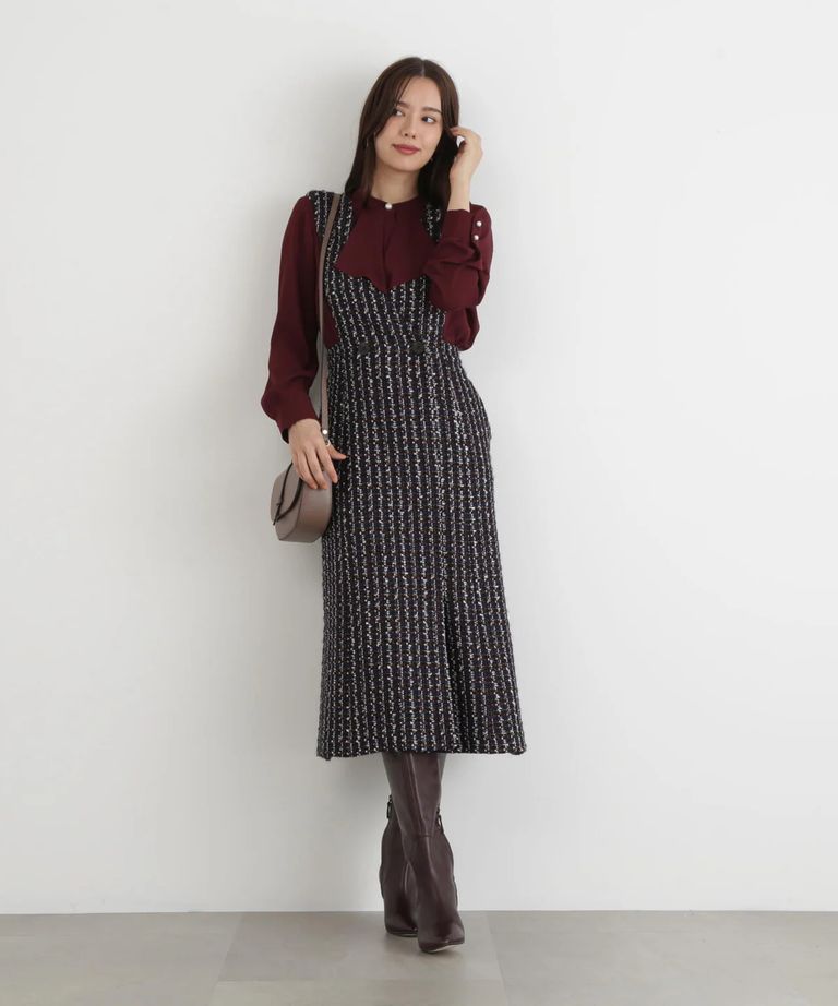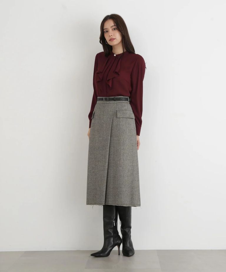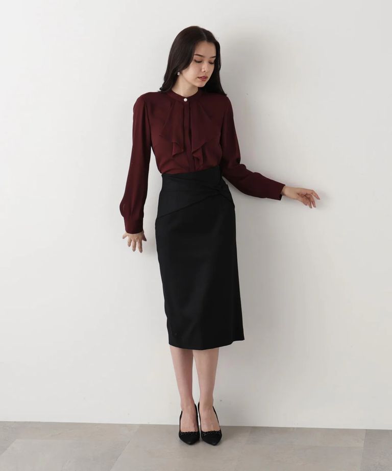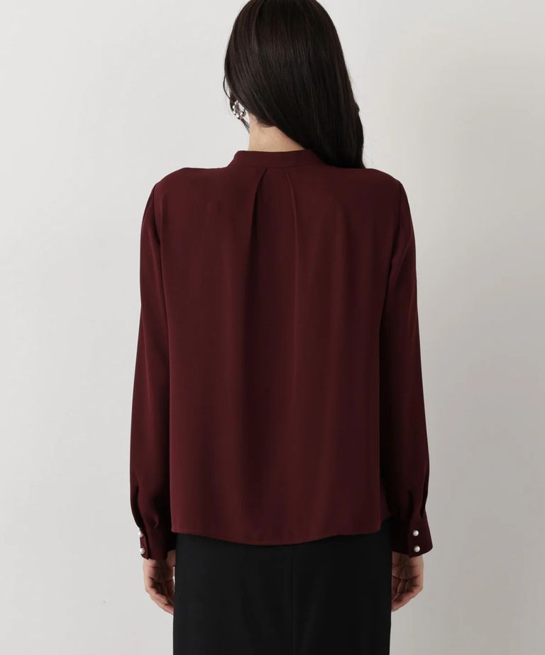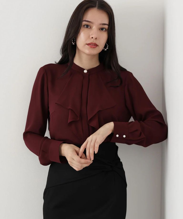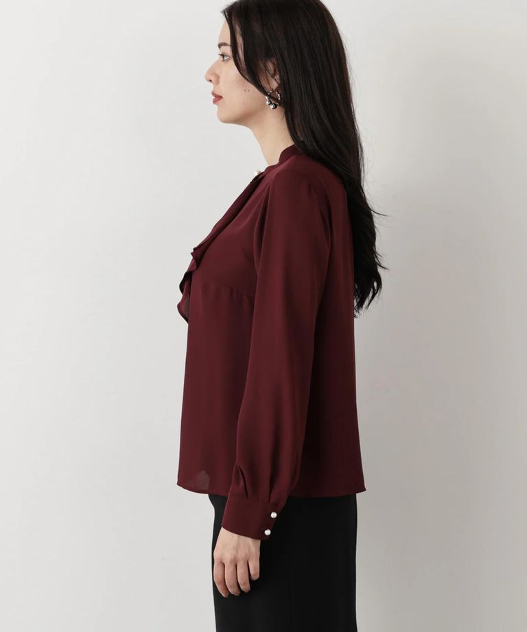 フロントラッフルパールボタンブラウス(ワイン)ポリエステル / ウォッシャブル / 手洗い可 / ストレッチあり / 裏地無し / 前比翼釦あき / 0315210104
