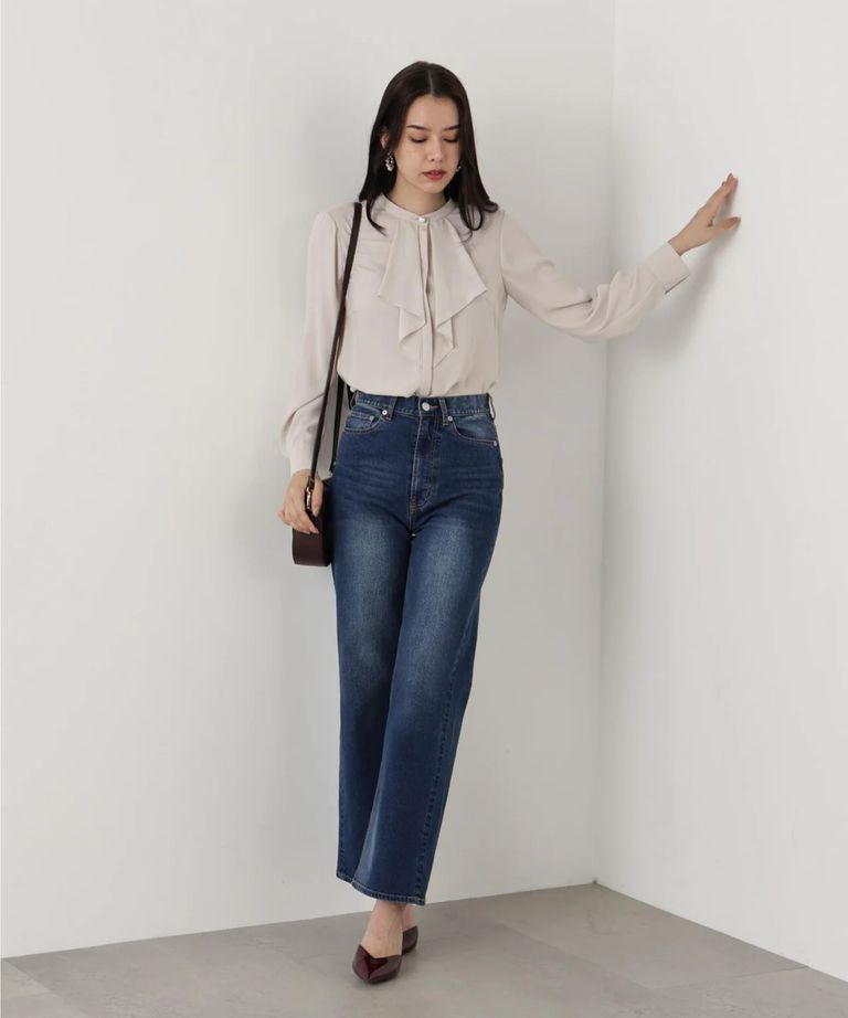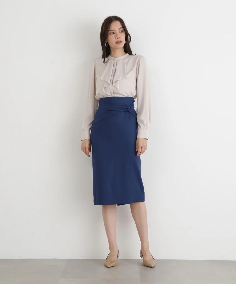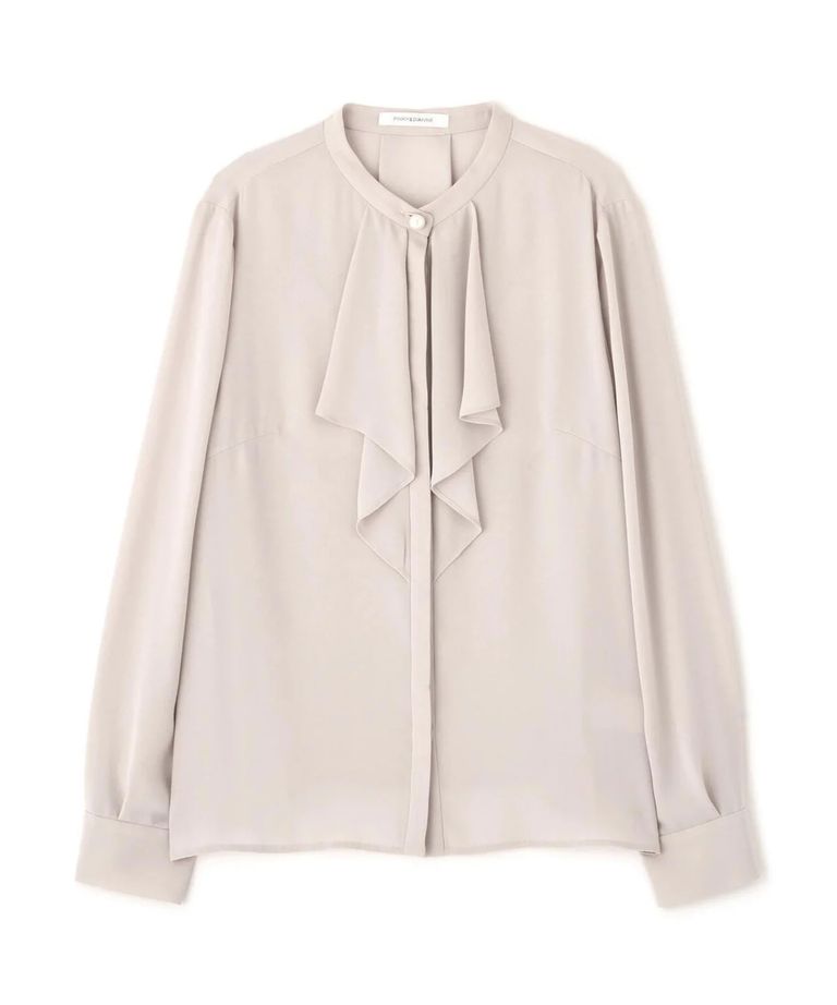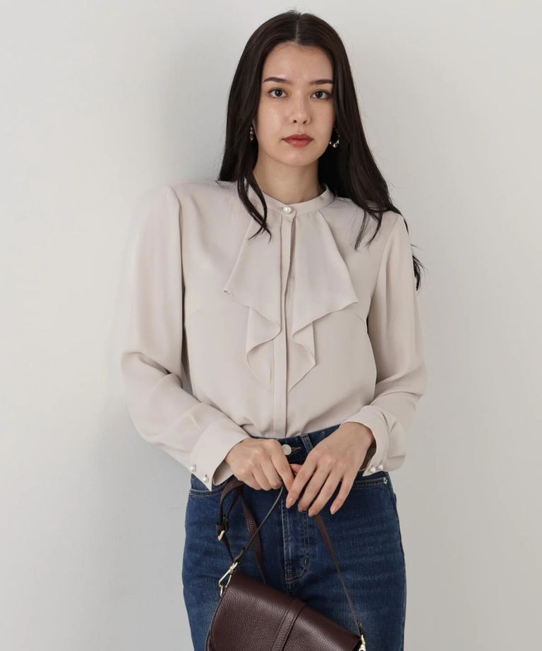 フロントラッフルパールボタンブラウス(ベージュ)ポリエステル / ウォッシャブル / 手洗い可 / ストレッチあり / 裏地無し / 前比翼釦あき / 0315210104