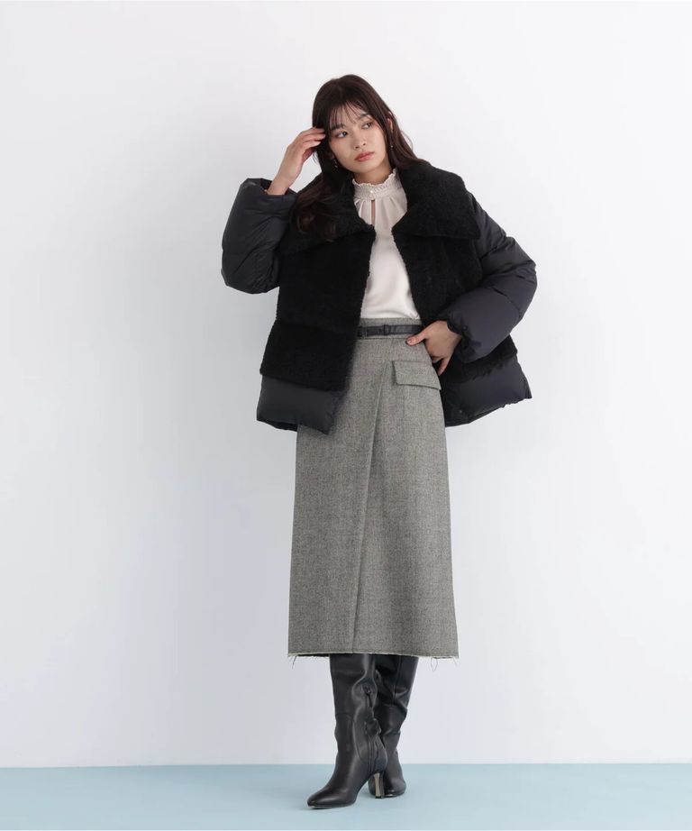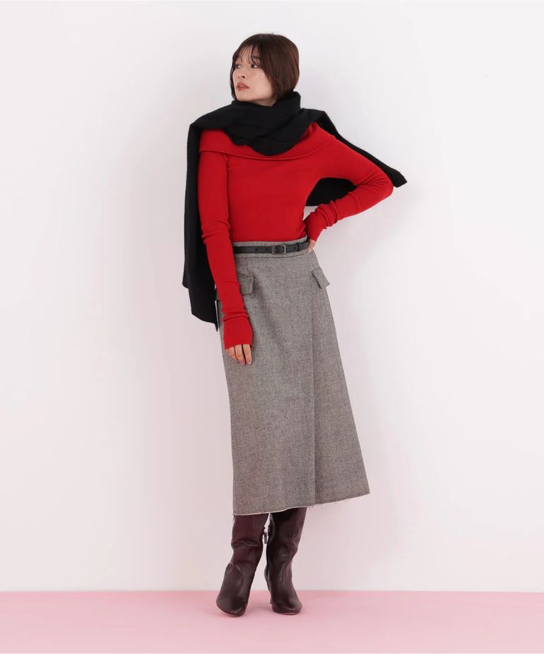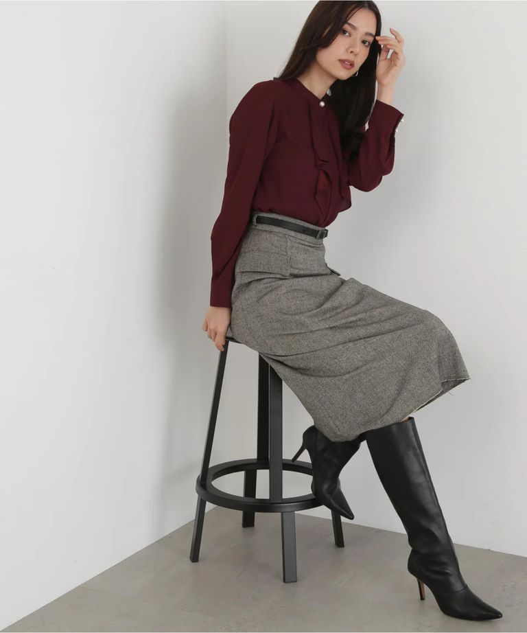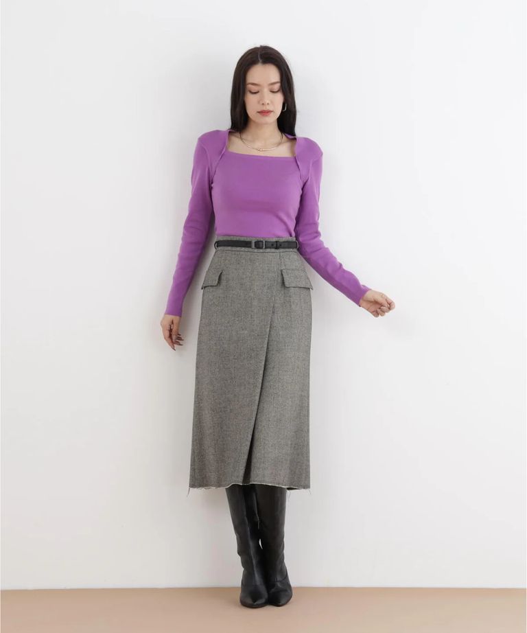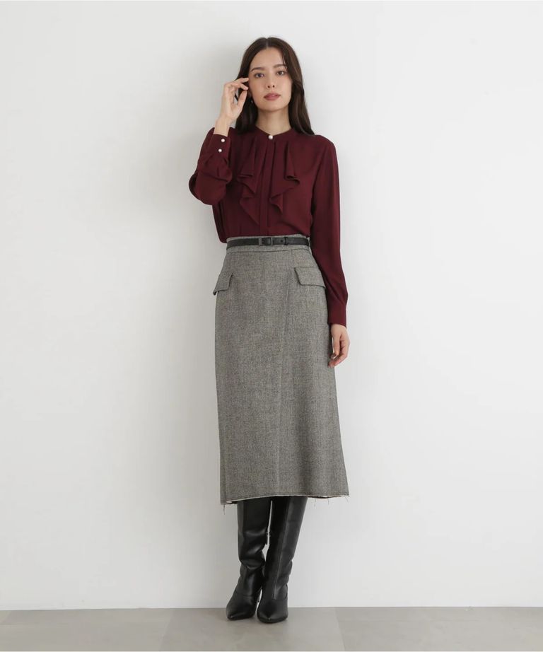 クラシカルツイードレザーベルト付きスカート(ブラック)毛 / 裏地あり / 合皮ベルト付き / 脇ファスナー / 0315220121