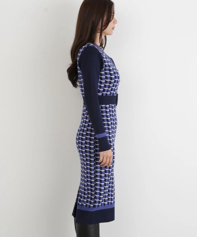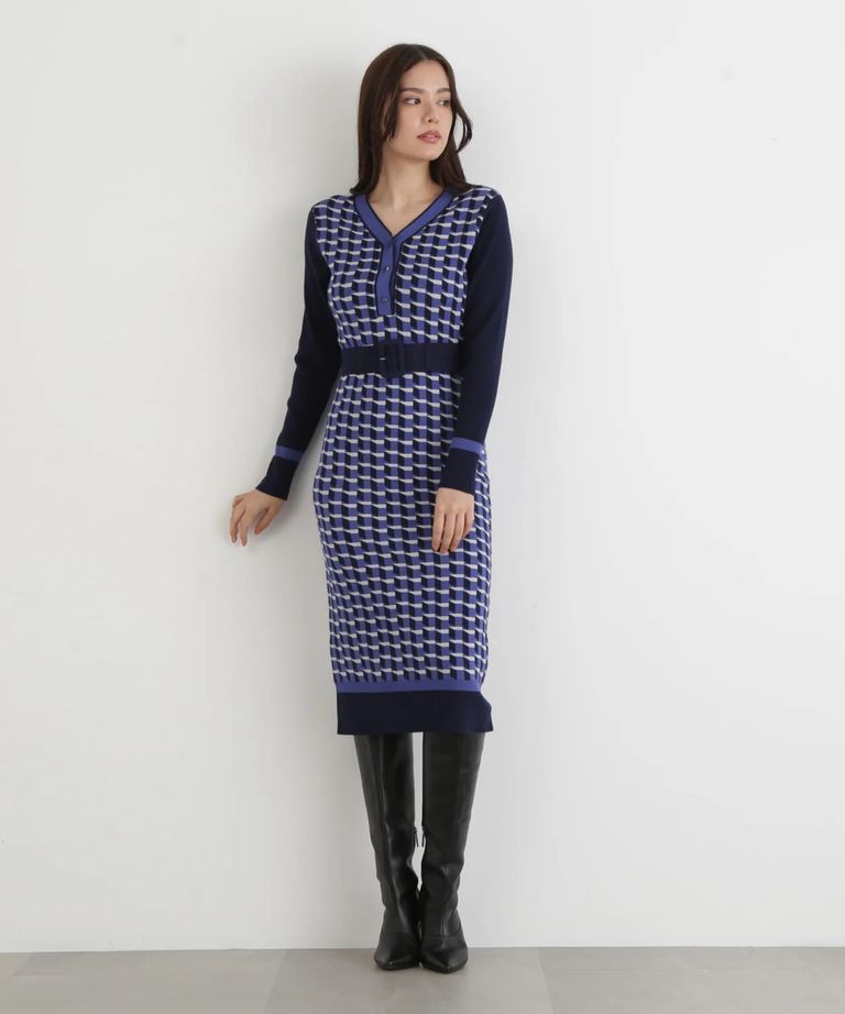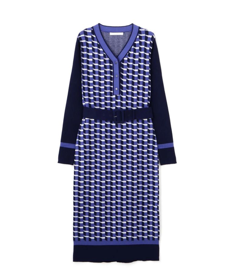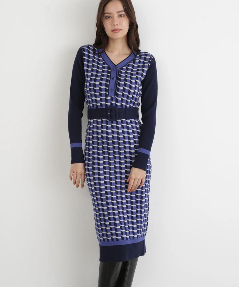 ジオメトリックジャガードニットワンピース(ブルー)レーヨン / 裏地無し / 袖釦あり / 前ベンツ / ベルト付き / ストレッチあり / 0315247113