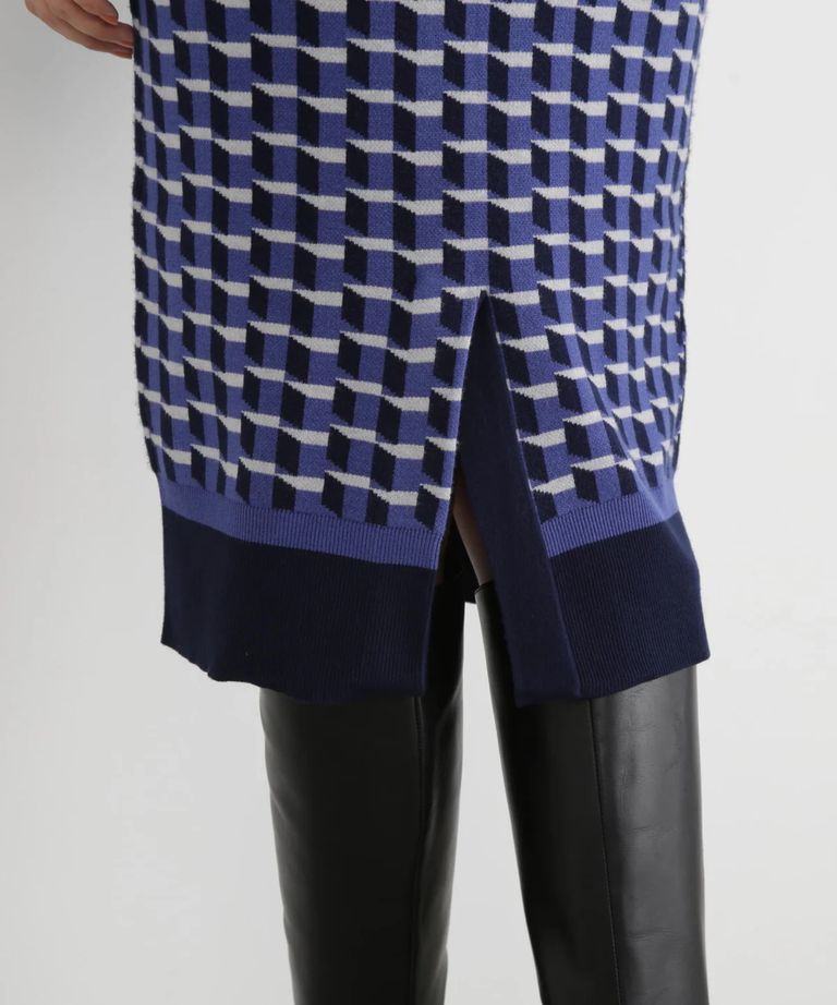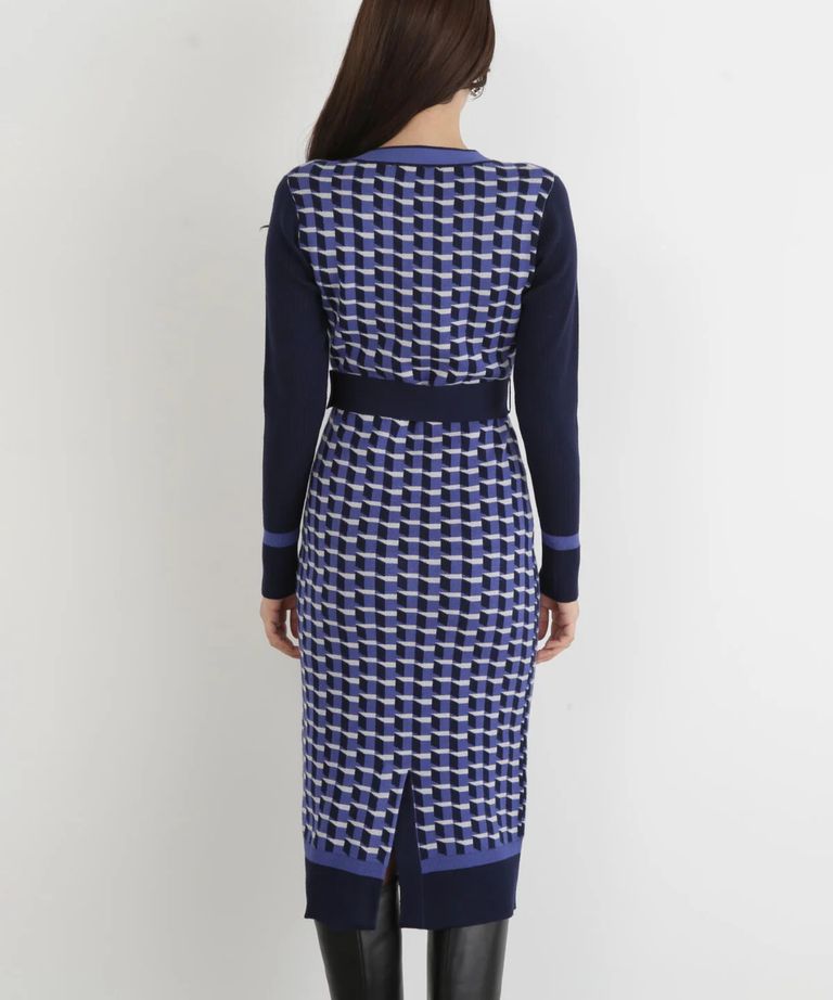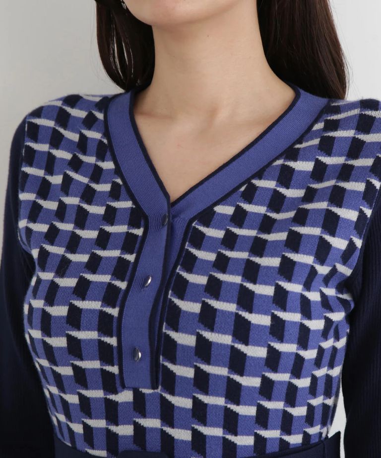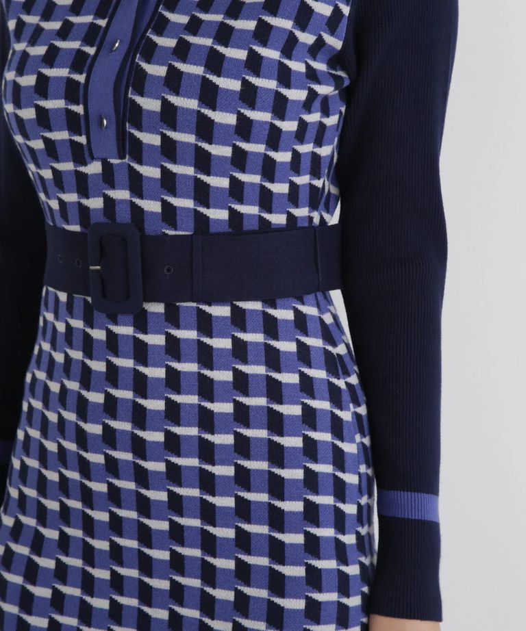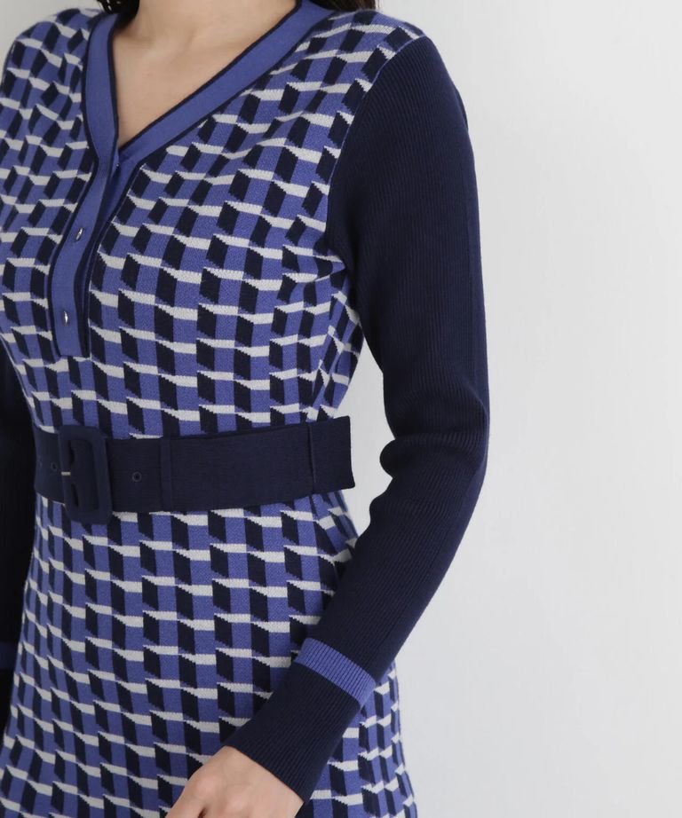 ジオメトリックジャガードニットワンピース(ブルー)レーヨン / 裏地無し / 袖釦あり / 前ベンツ / ベルト付き / ストレッチあり / 0315247113
