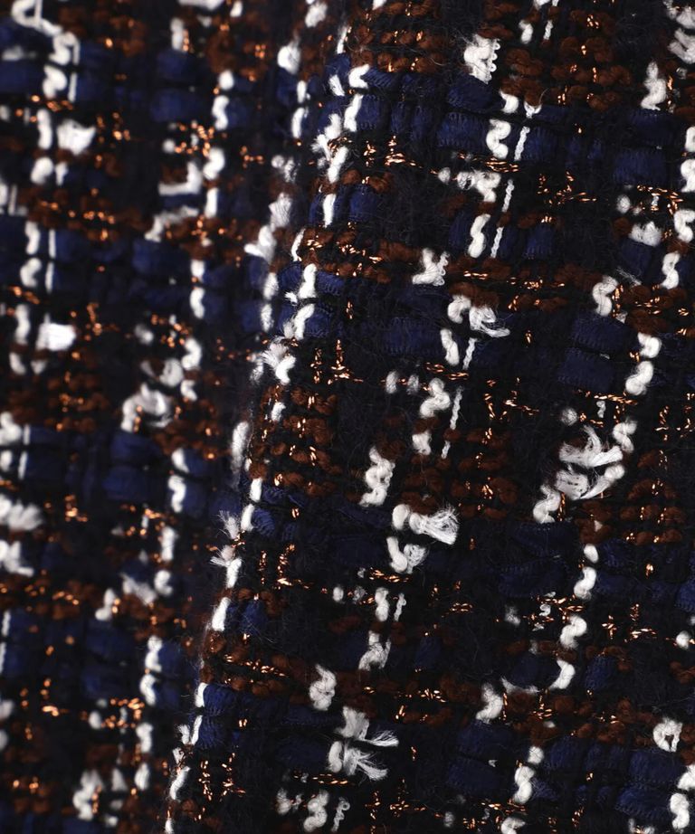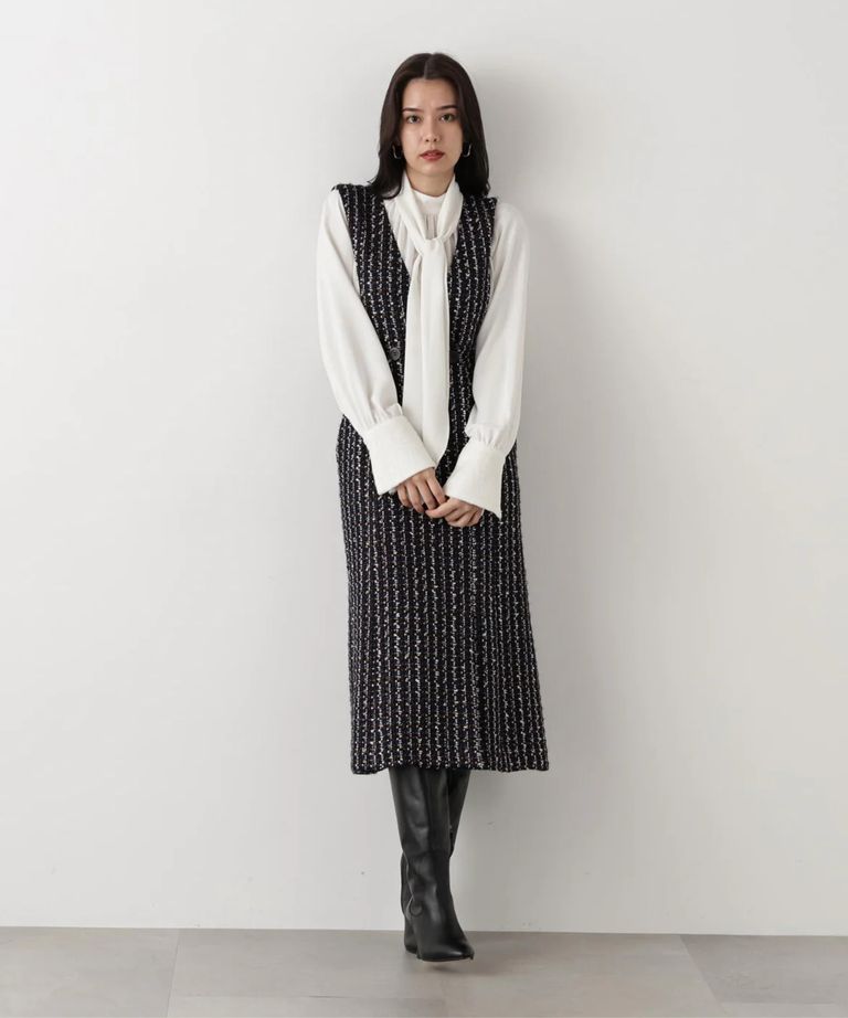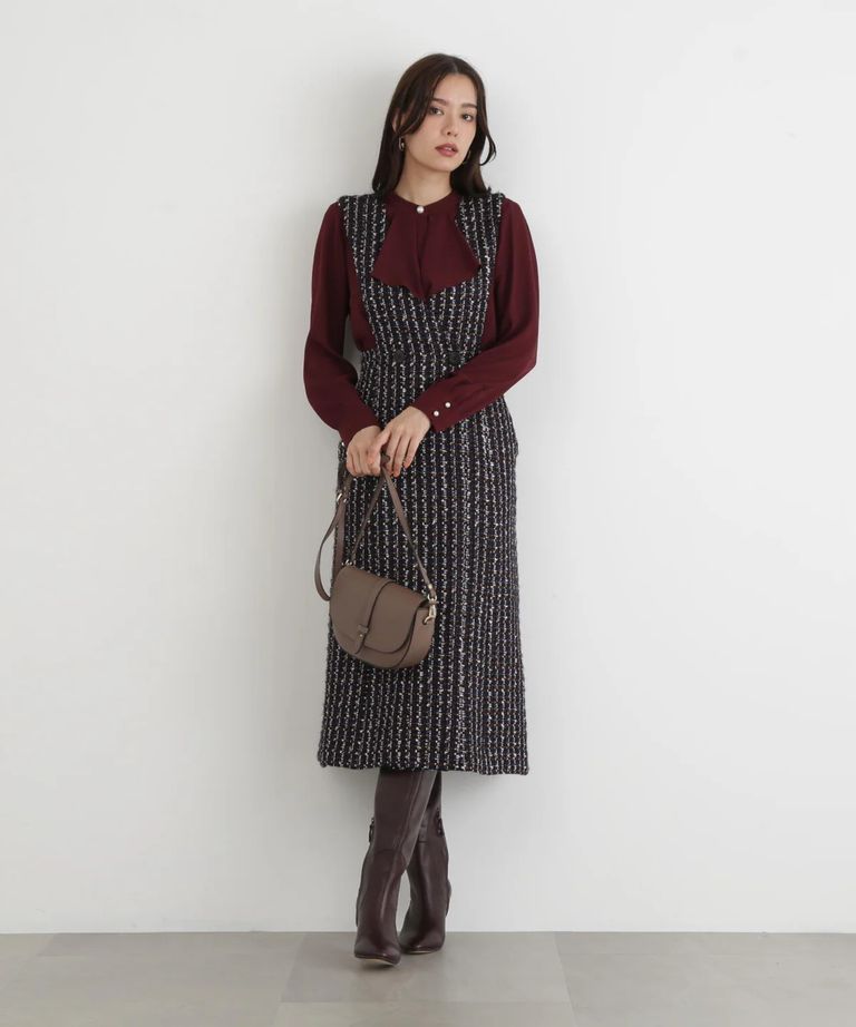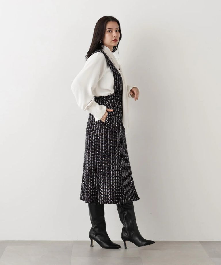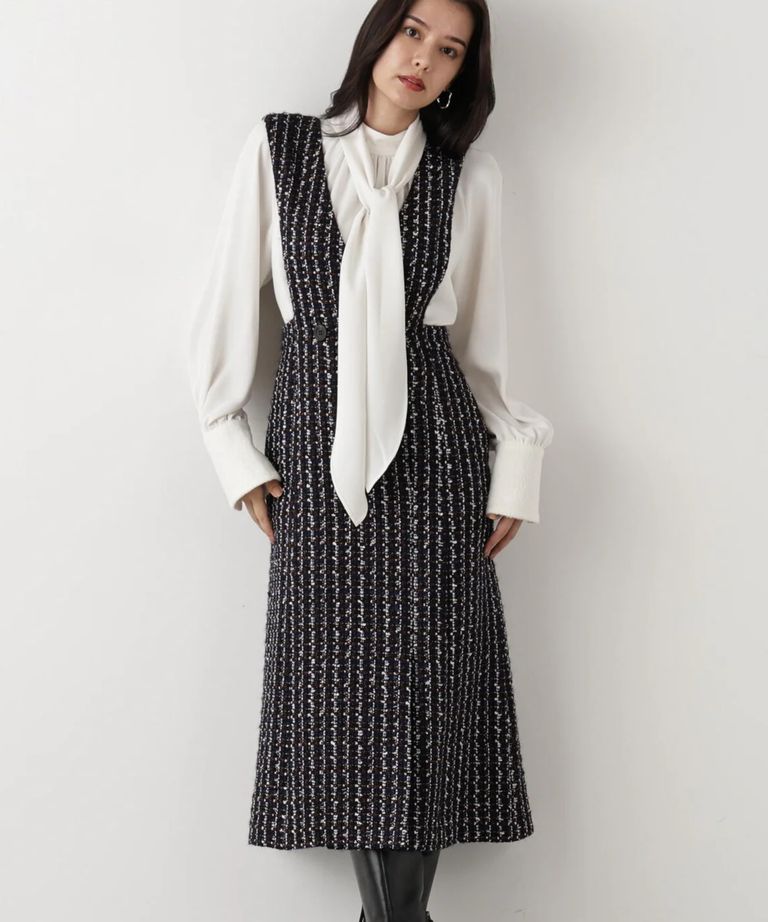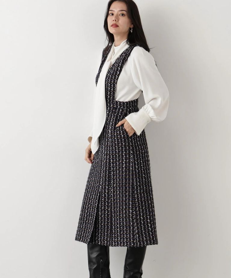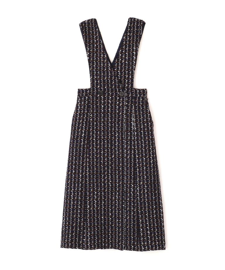 リープツイードジャンパースカート(ネイビー)毛 / ストレッチ無し / 前ボタンあき / ポケットあり / 裏地あり / 前裾ベンツあきあり / ふくらはぎ下くらいの丈 / 0315240009