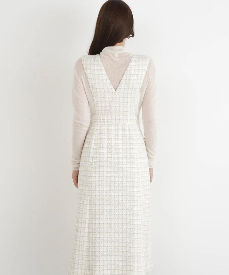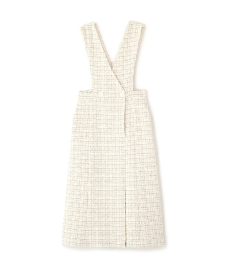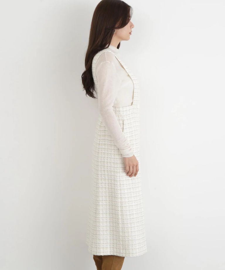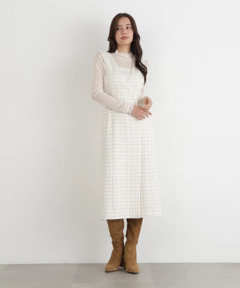 リープツイードジャンパースカート(エクリュ)毛 / ストレッチ無し / 前ボタンあき / ポケットあり / 裏地あり / 前裾ベンツあきあり / ふくらはぎ下くらいの丈 / 0315240009