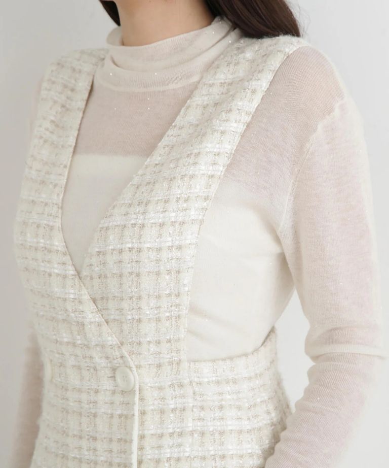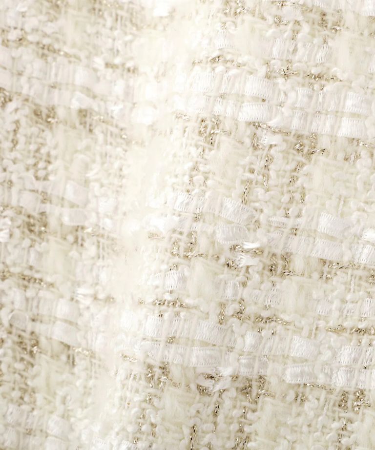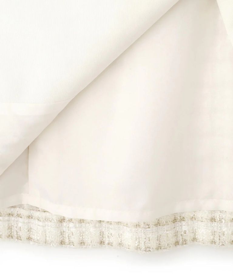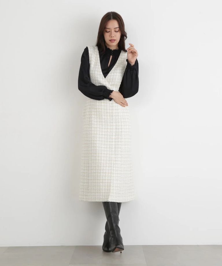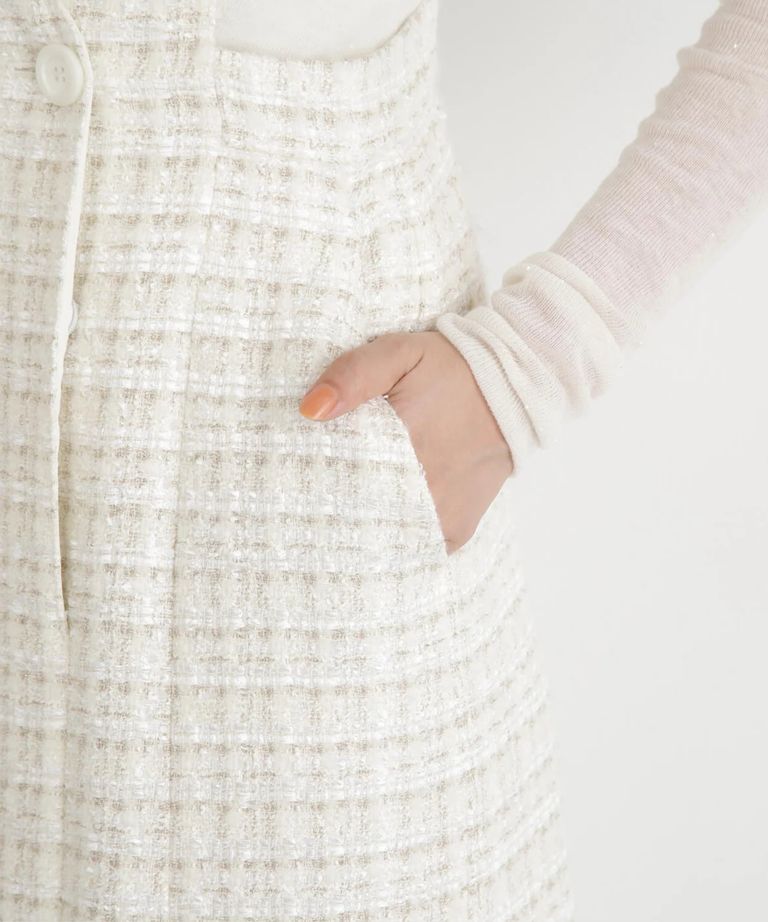 リープツイードジャンパースカート(エクリュ)毛 / ストレッチ無し / 前ボタンあき / ポケットあり / 裏地あり / 前裾ベンツあきあり / ふくらはぎ下くらいの丈 / 0315240009