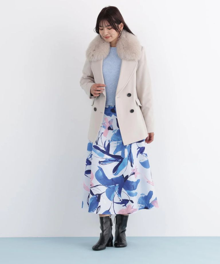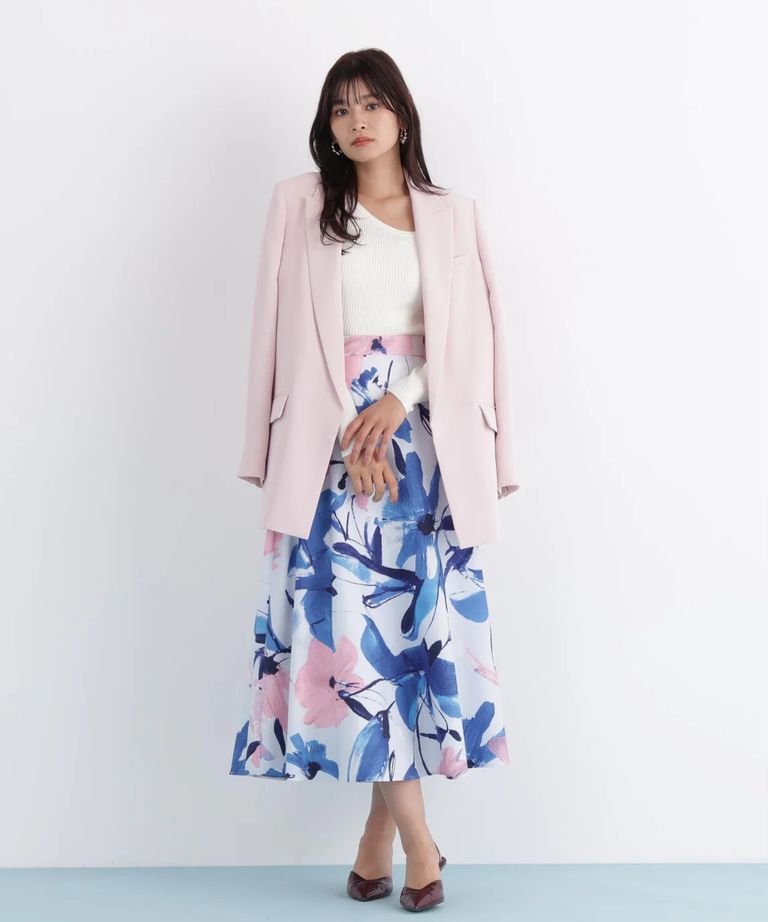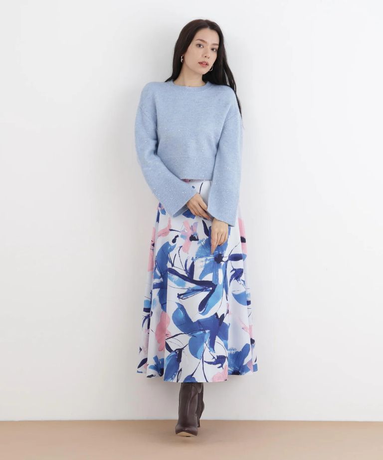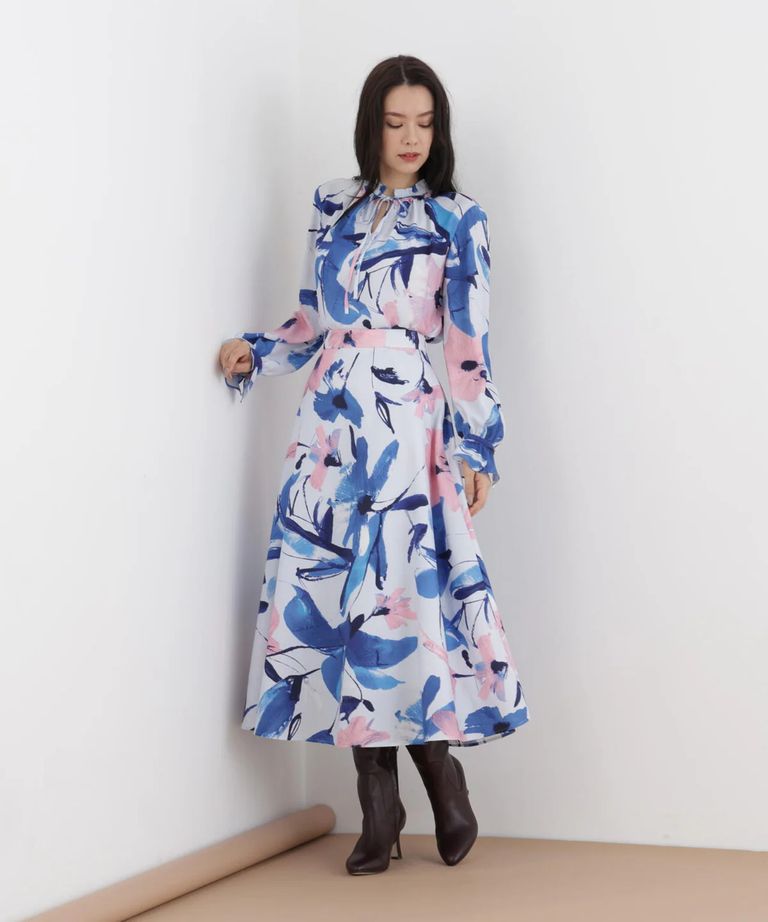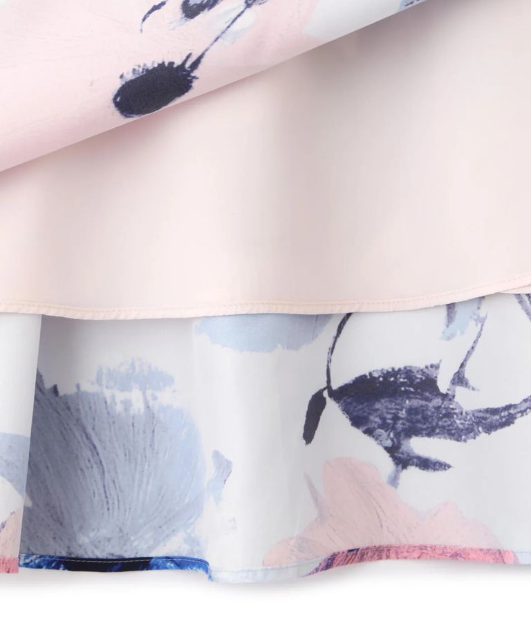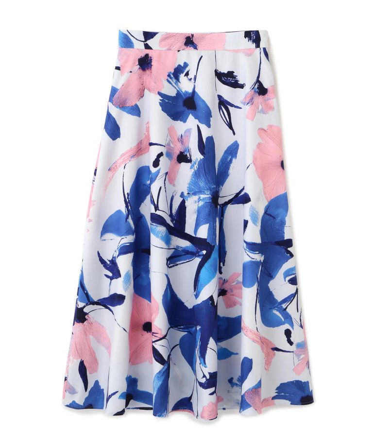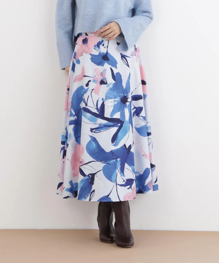 フラワープリントタフタフレアースカート(ブルー系)ポリエステル / ストレッチ無し / 裏地あり / くるぶしくらいの丈 / 脇ファスナーあき / 0316120120