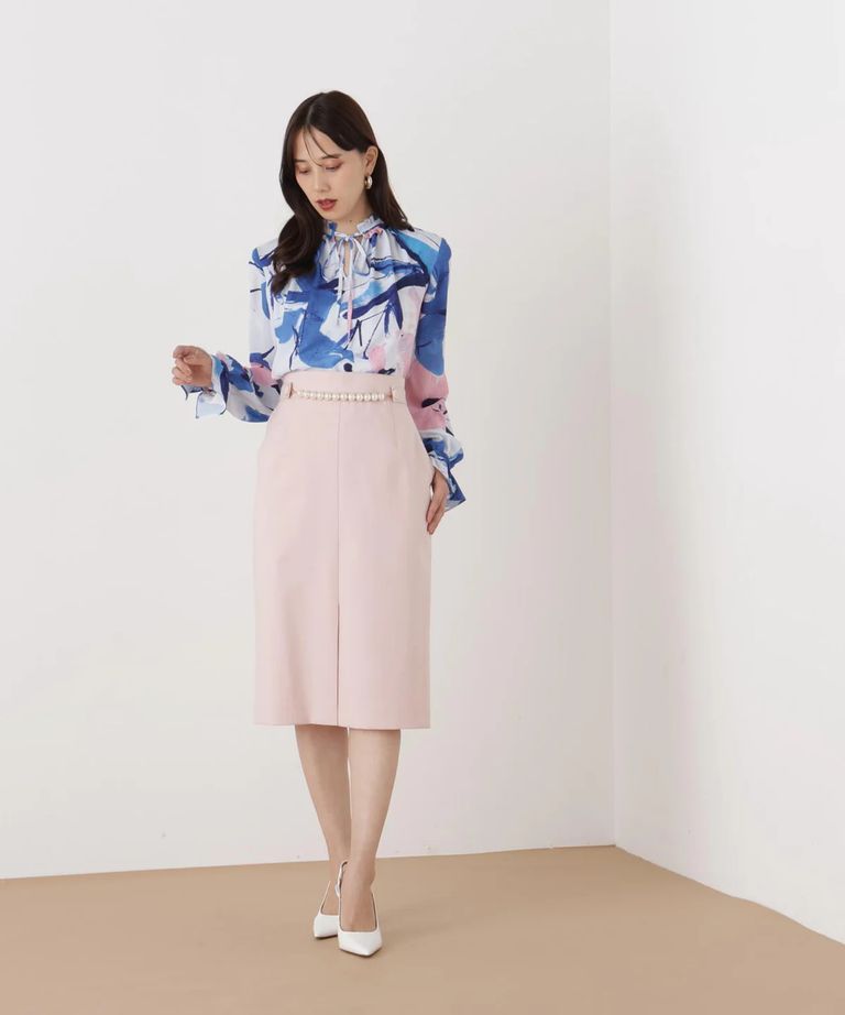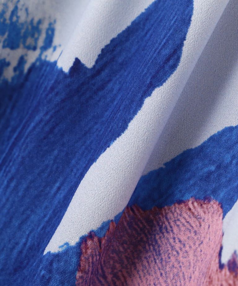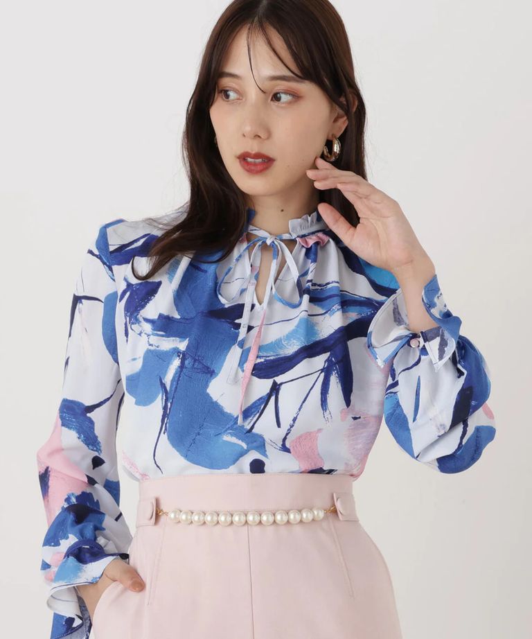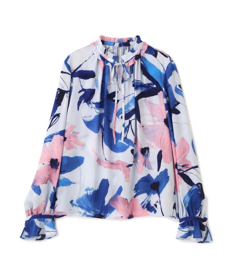 フラワープリントギャザーブラウス(ブルー系)ポリエステル / ストレッチ性無し / 裏無し / 後ろボタンあきありのかぶり / 0316110120