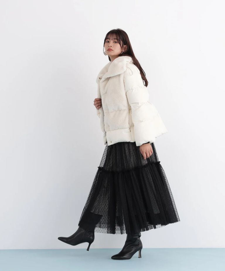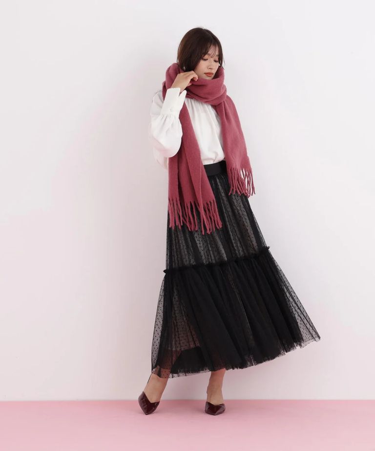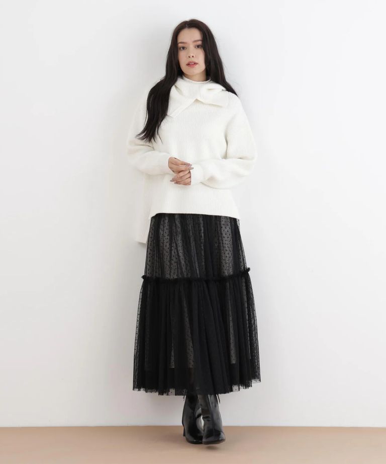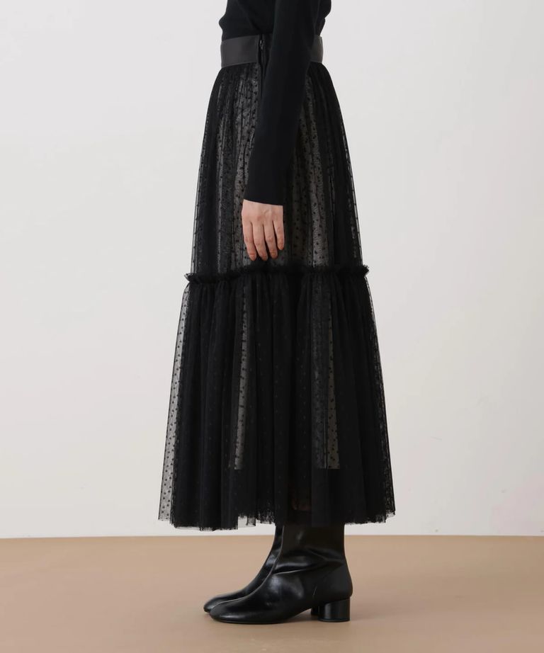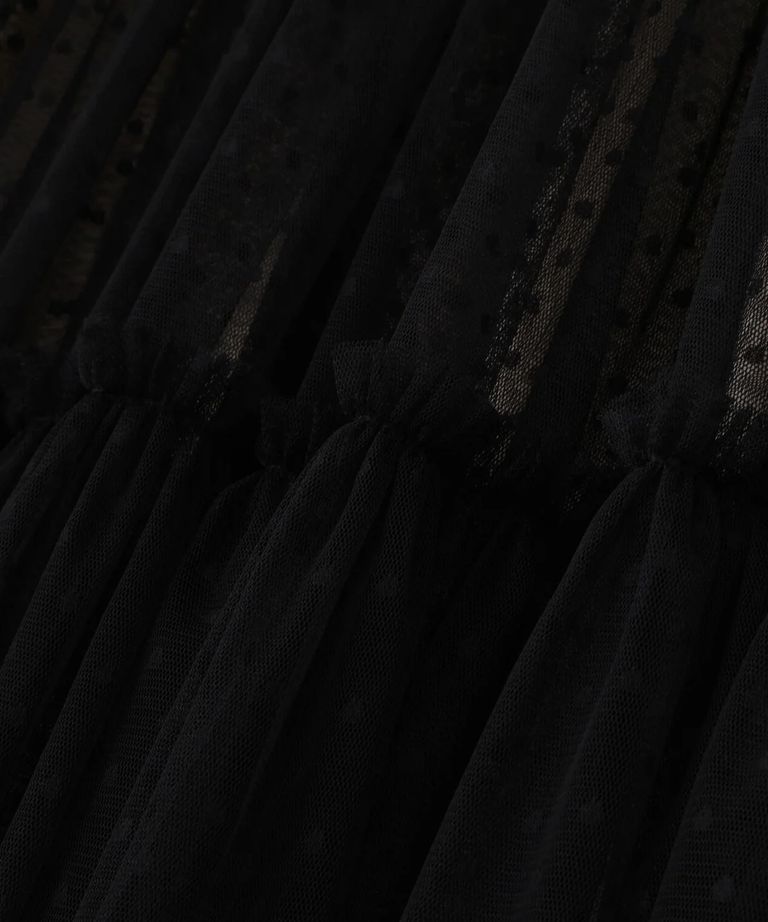 ドットチュールギャザーティアードスカート(ブラック)ポリエステル / ストレッチなし / 裏地付き / 左脇ファスナー / くるぶしくらいの丈 / 0316120122