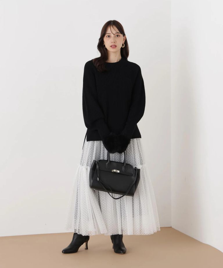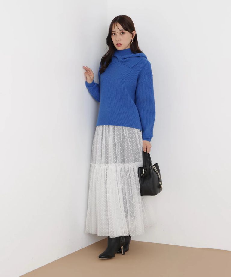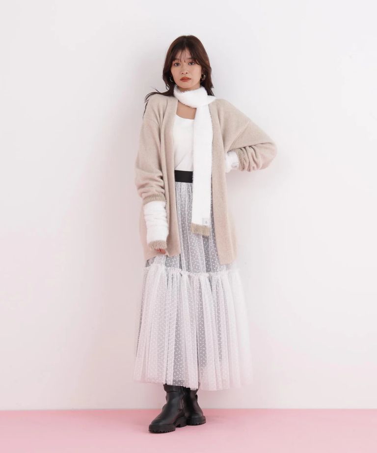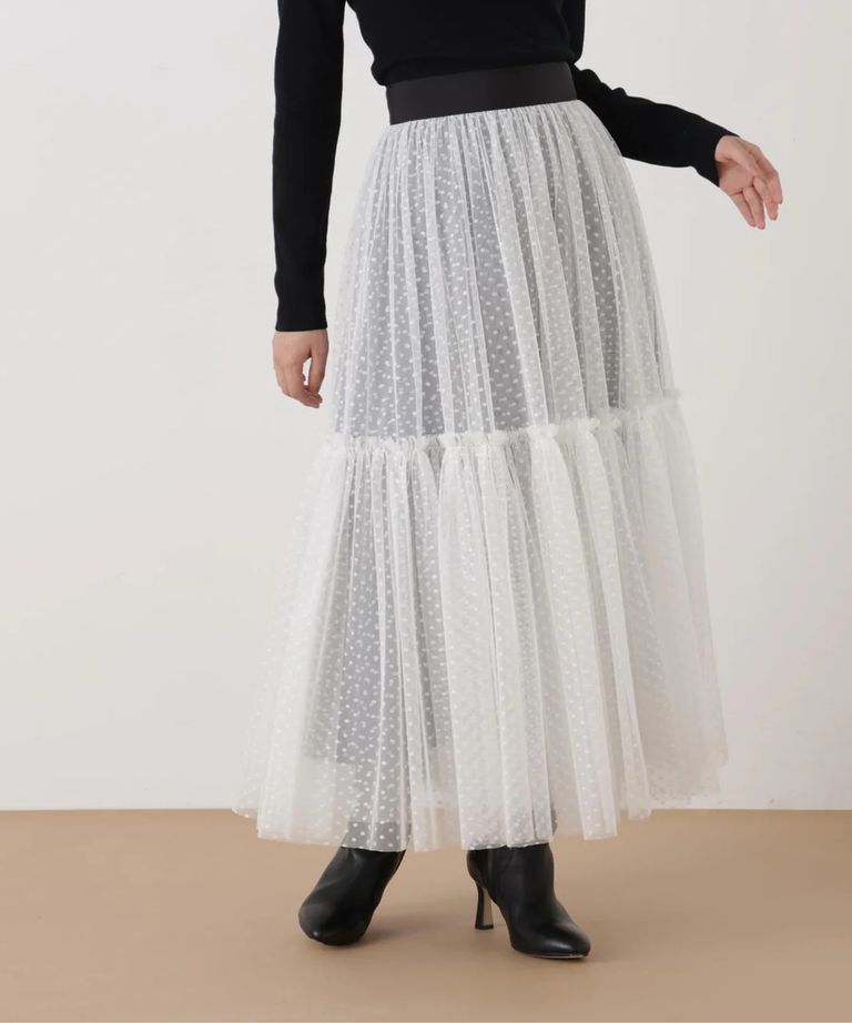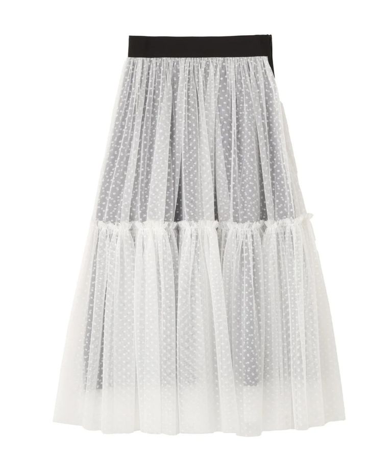 ドットチュールギャザーティアードスカート(ホワイト)ポリエステル / ストレッチなし / 裏地付き / 左脇ファスナー / くるぶしくらいの丈 / 0316120122