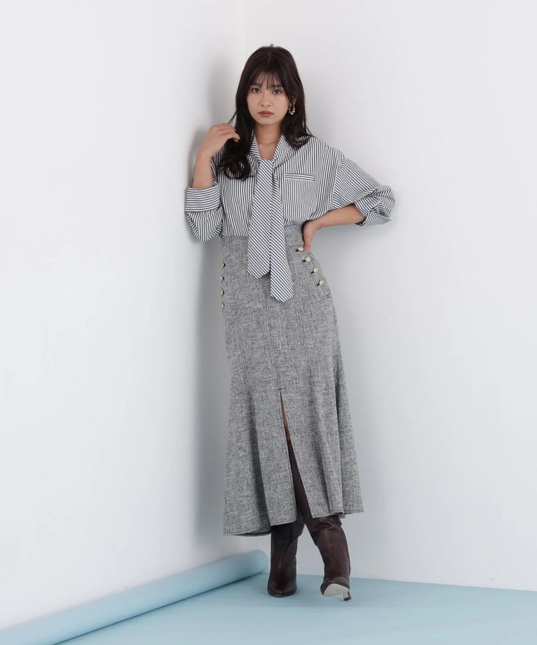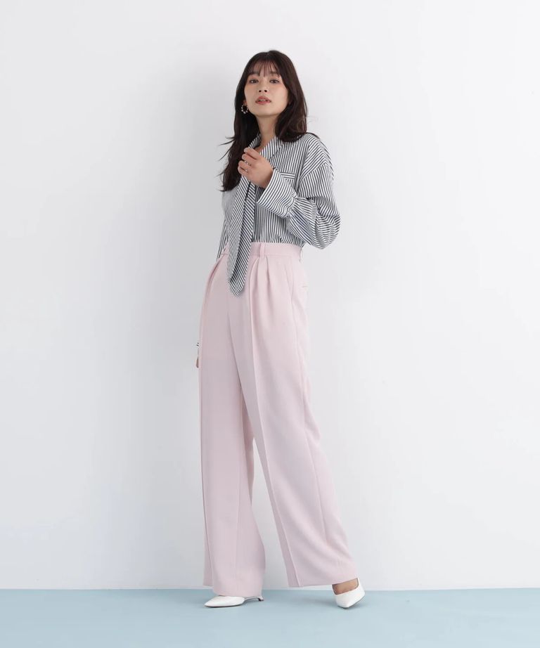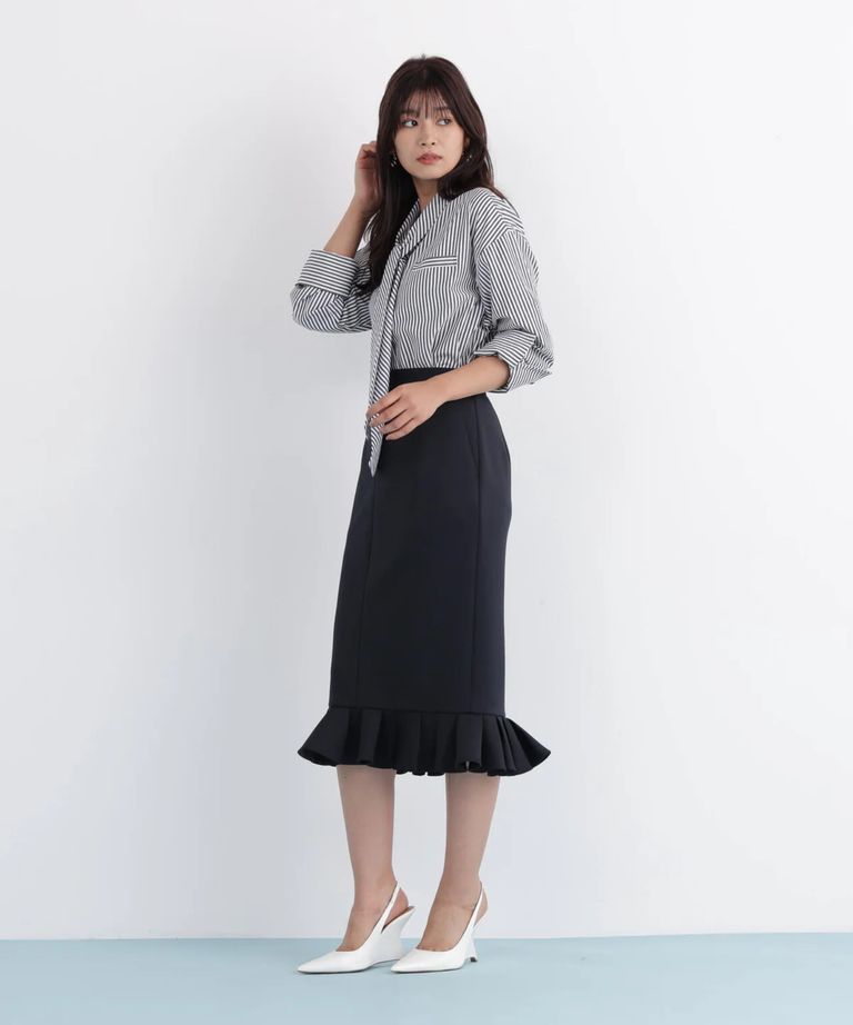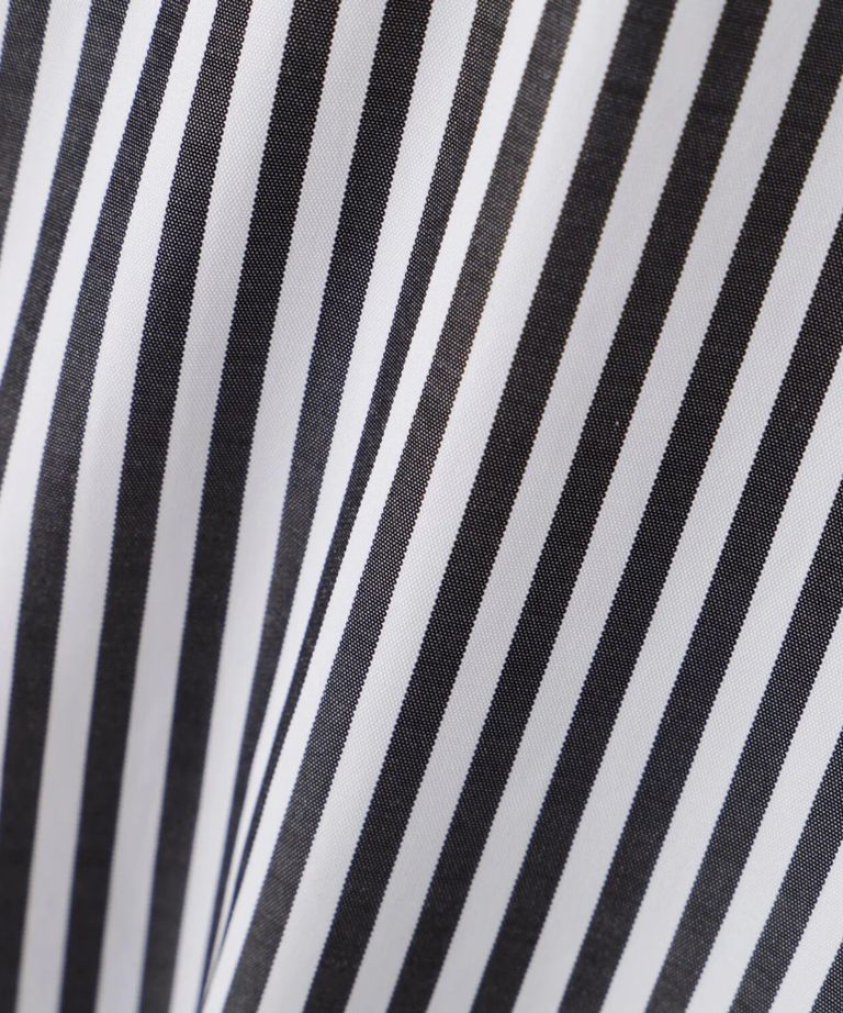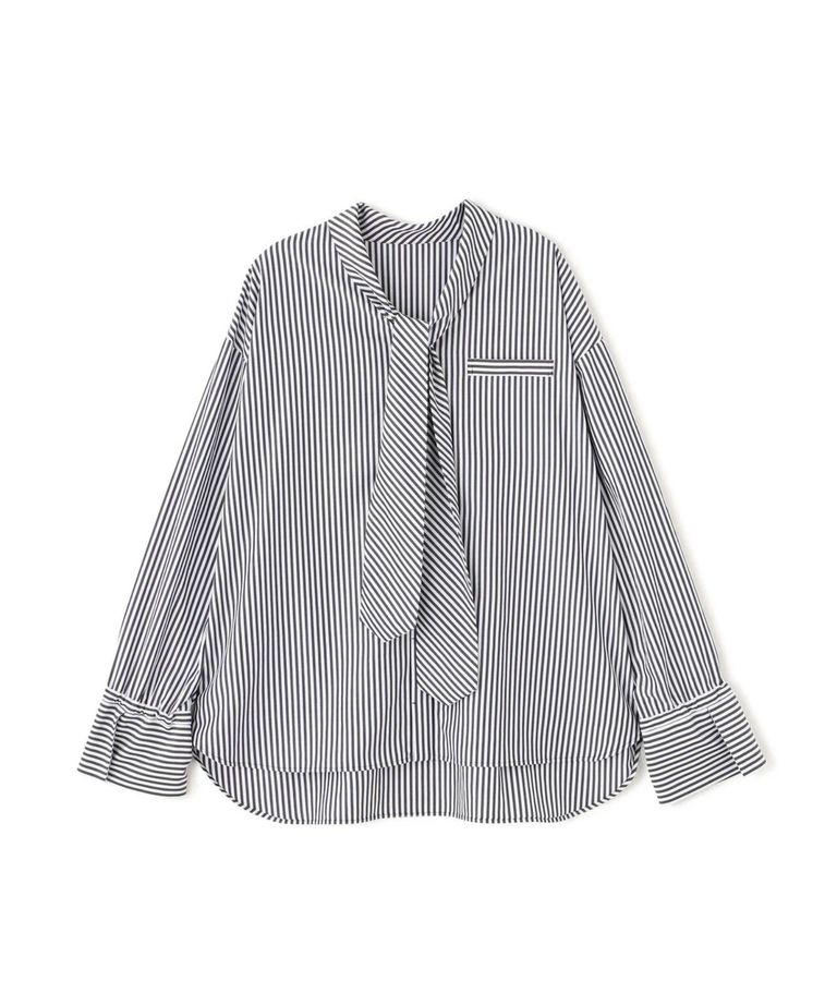 ストライプタイネックシャツ(ブラック系)ポリエステル / ストレッチ無し / 裏地無し / 前比翼あき / 衿から続きのリボン付き / 左胸に飾りポケット / 0316110101
