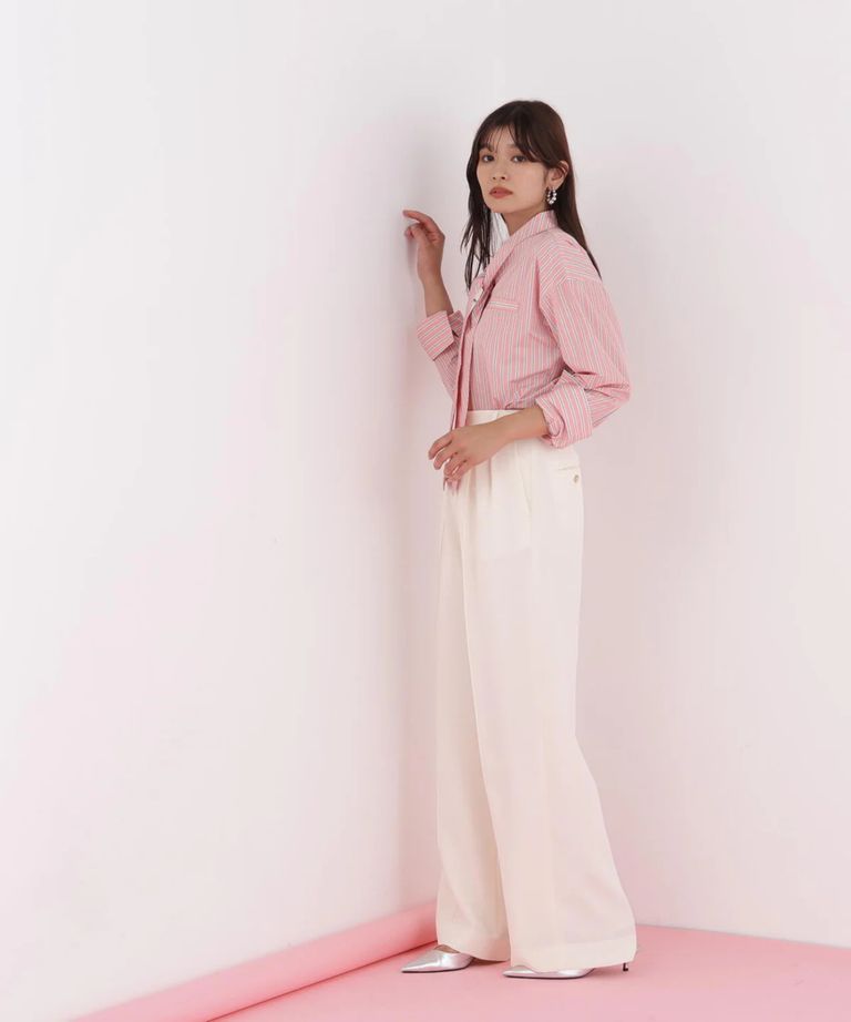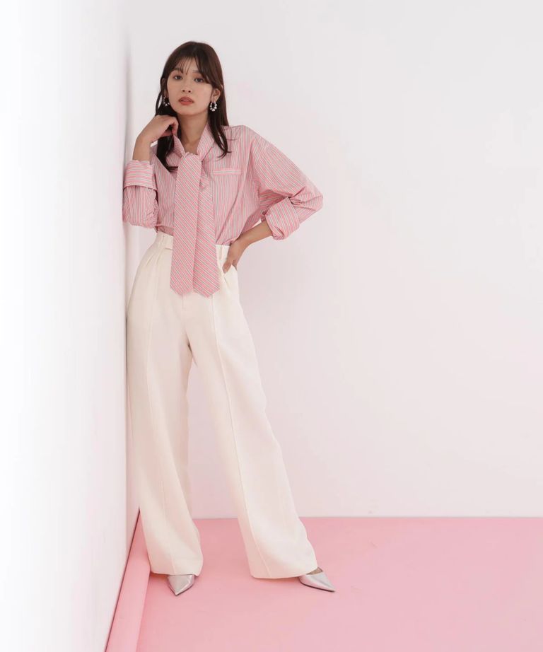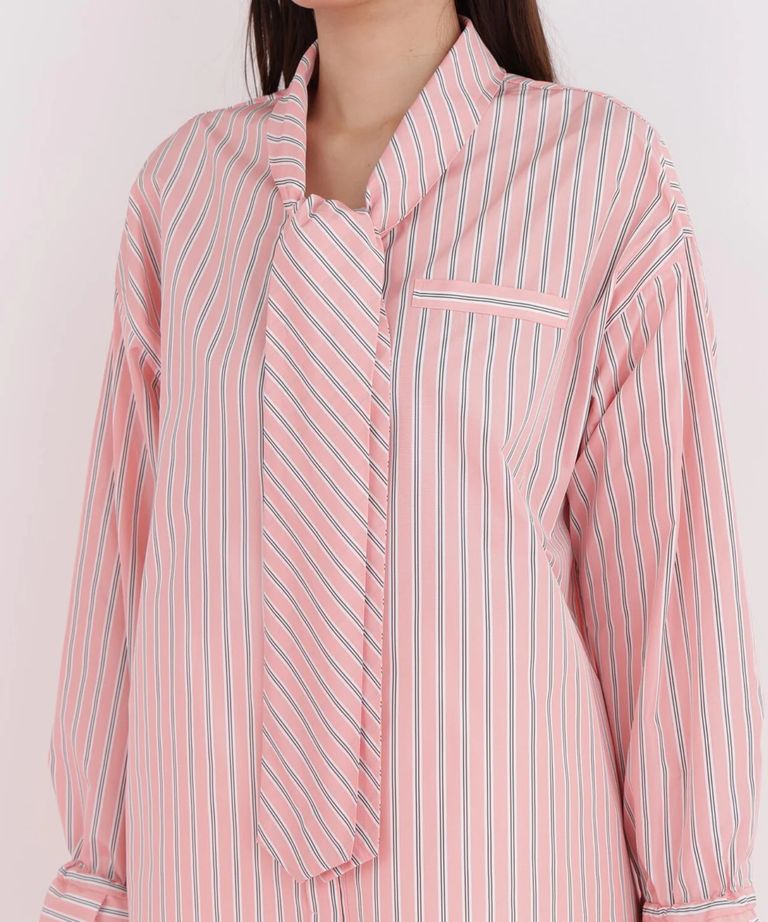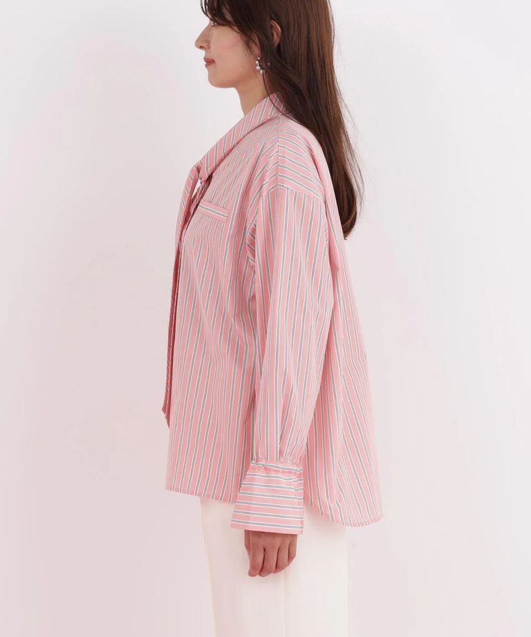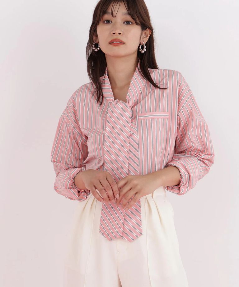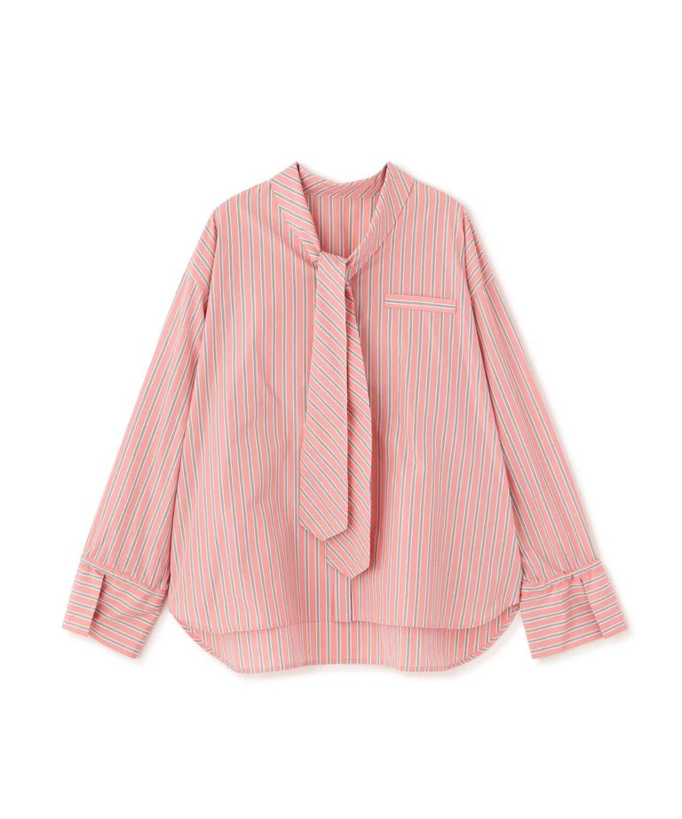 ストライプタイネックシャツ(ピンク系)ポリエステル / ストレッチ無し / 裏地無し / 前比翼あき / 衿から続きのリボン付き / 左胸に飾りポケット / 0316110101