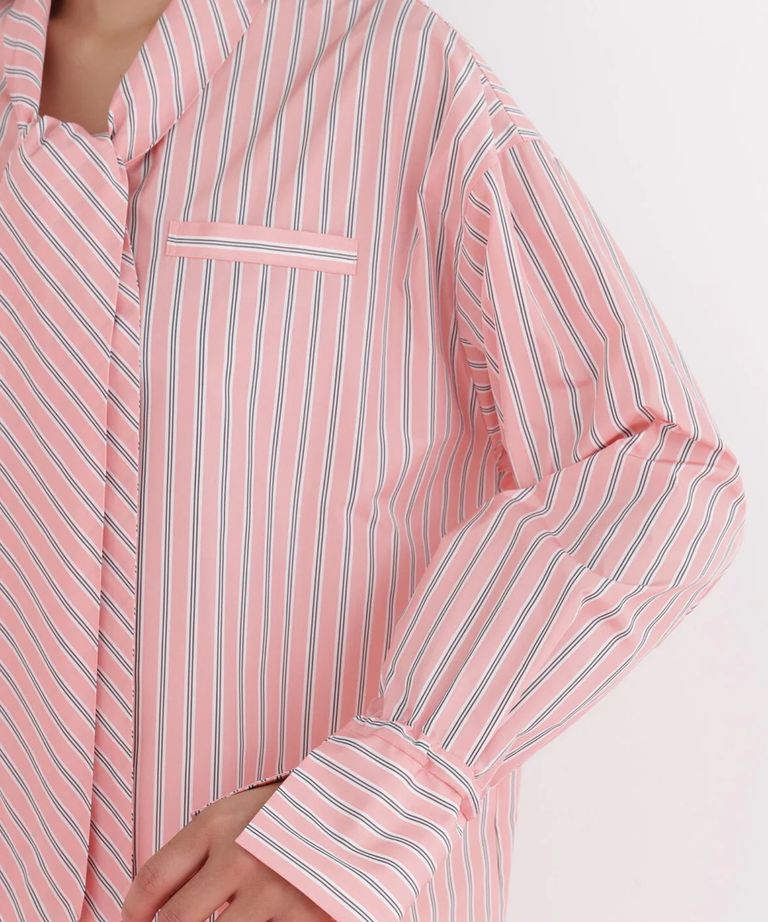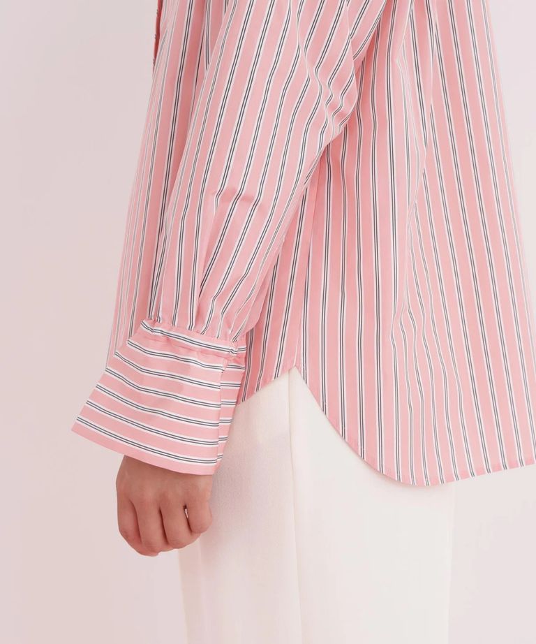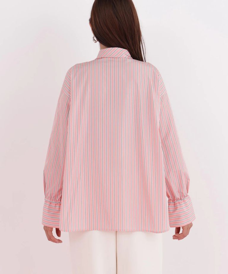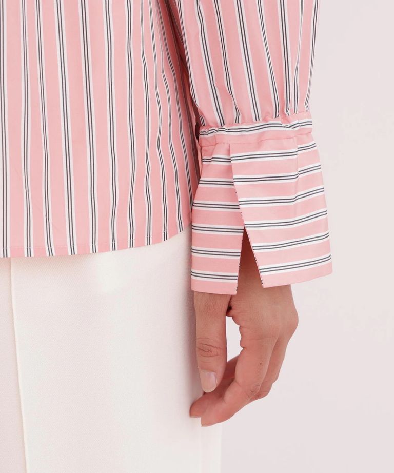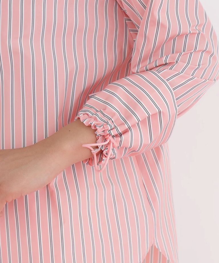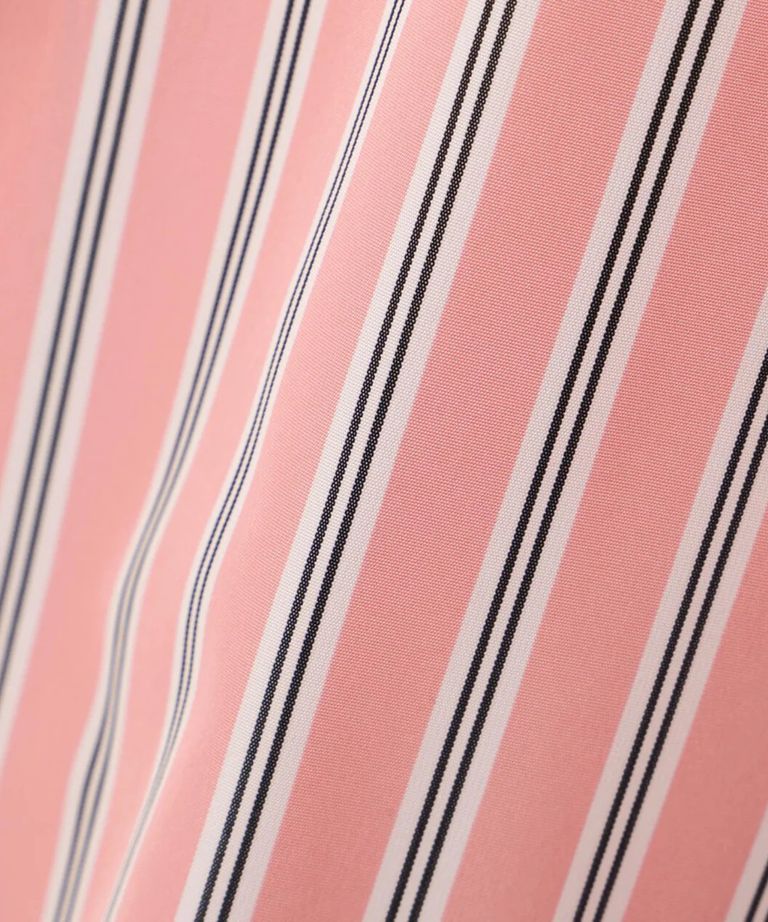 ストライプタイネックシャツ(ピンク系)ポリエステル / ストレッチ無し / 裏地無し / 前比翼あき / 衿から続きのリボン付き / 左胸に飾りポケット / 0316110101