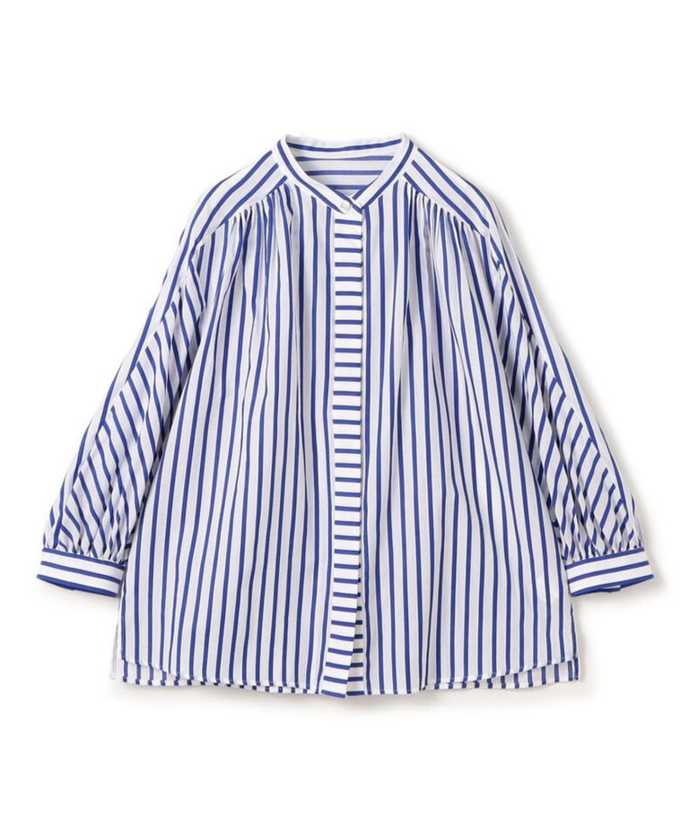 トラックストライプ ギャザーブラウス(ブルー系) コットン / やや薄手/ 透け感有り / 手洗可 / 13-01-61-01008