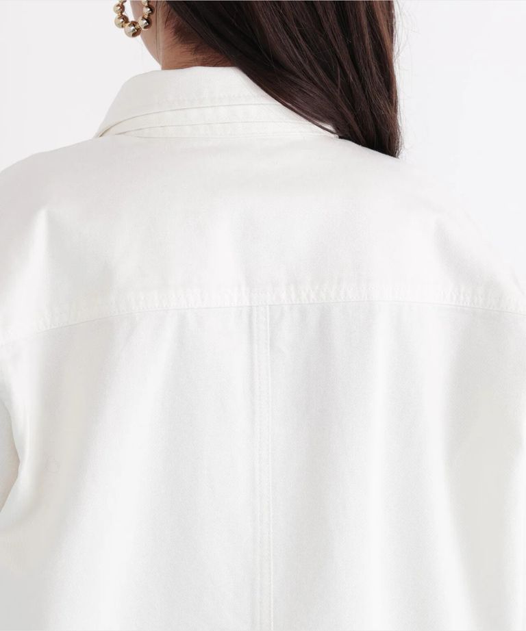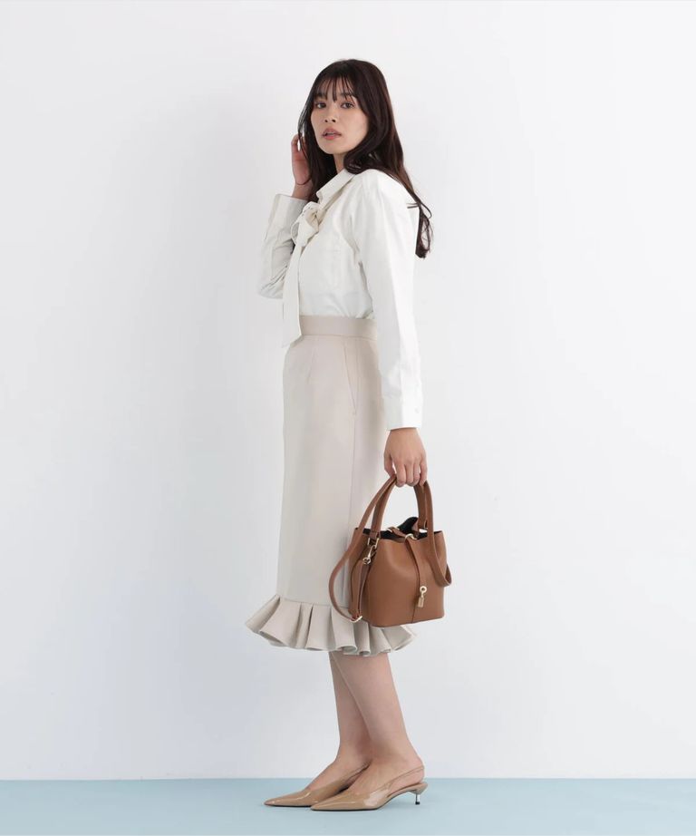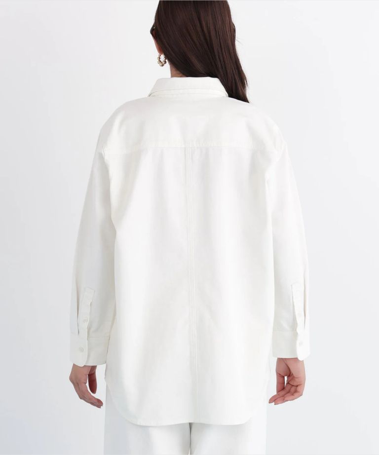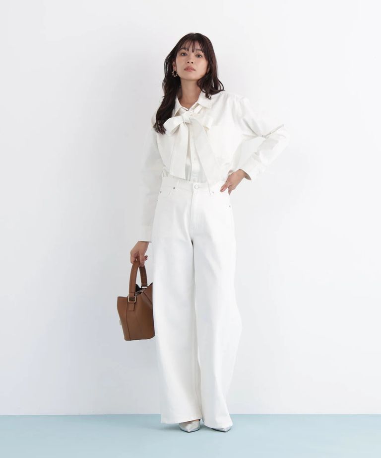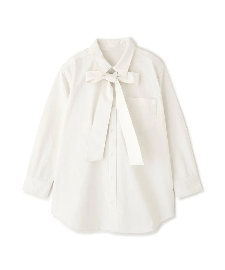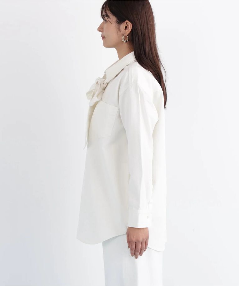 ネックリボンデニムシャツ(ホワイト)コットン100% / ストレッチなし / ボタンあき / 取り外しボウタイ付き / 胸ポケット×1 / 0316110108