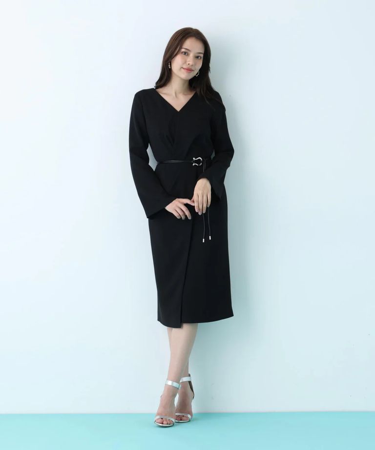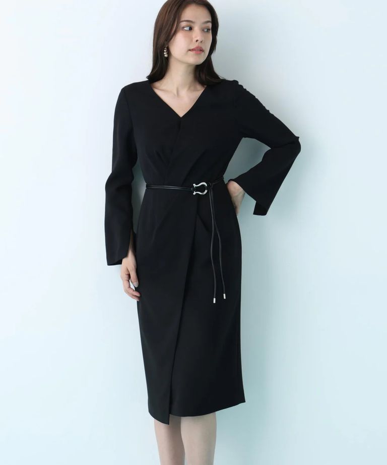 タッククロスウエストワンピース(ブラック) ポリエステル / ストレッチあり / 裏地付き(袖は裏無し) / 右脇奥にスリットあり / 後ろファスナー開き / 袖下にスリットあり / 0316140219