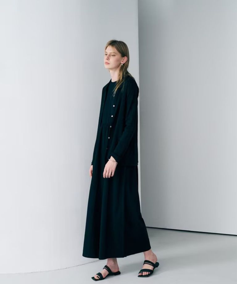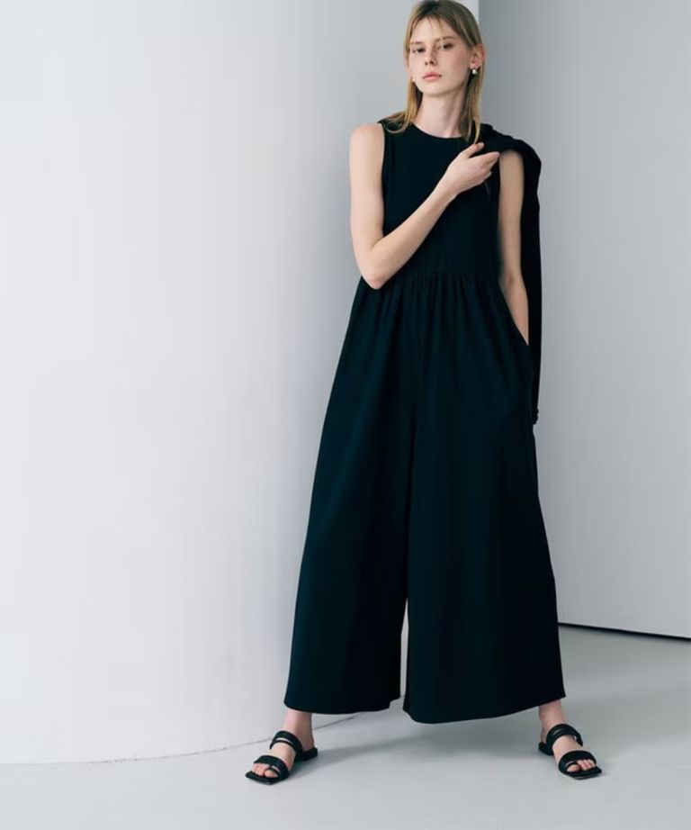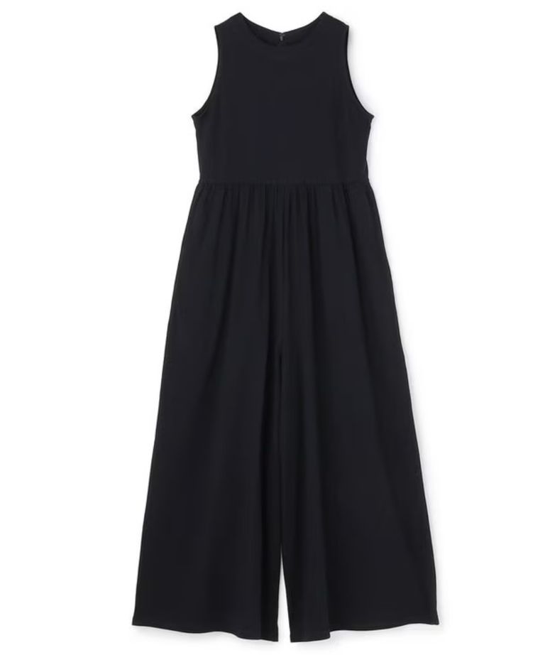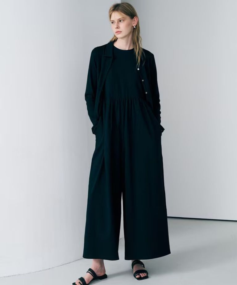 天竺編みジャージー素材を使用したオールインワンです。スッキリとした身頃感と、パンツのたっぷりとした分量感が気映えする1枚です。ジャージー素材の為コンパクトな身頃感でも着心地良く、また軽い素材なので分量のあるパンツでも軽やかに着用いただけます。1枚で完成する便利アイテムとして仕上げました。