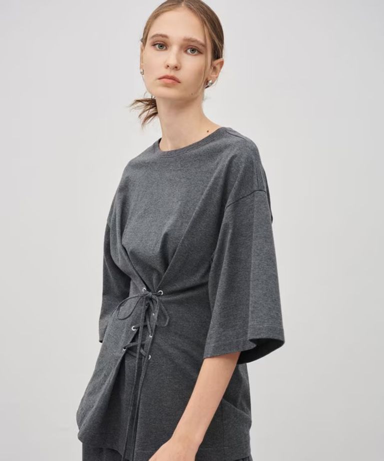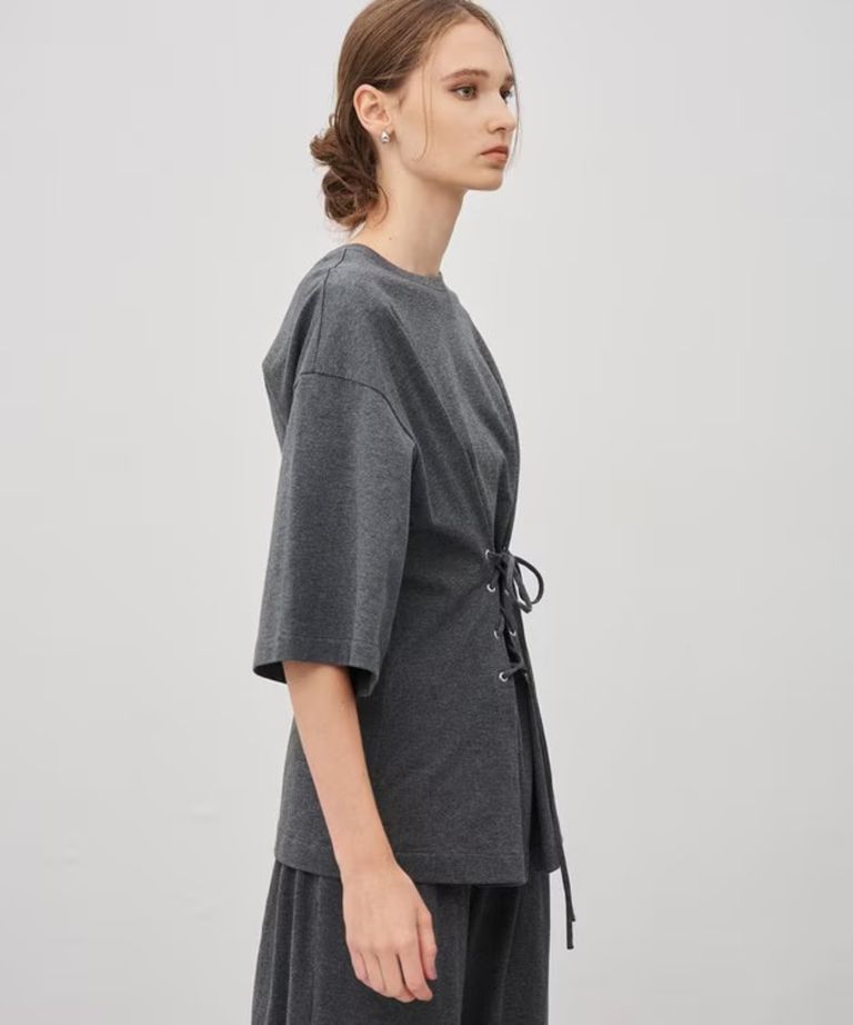ベーシック天竺を使用したレースアップTOPSです。ウエスト部分レースアップでフィット感を調節出来、シルエットを自由に変化させることが出来ます。身頃や袖のゆったりした部分がドレープとなりデザイン性の高いアイテムに仕上げました。前後2WAY着用が可能でスタイリングの幅が広がる1枚です。